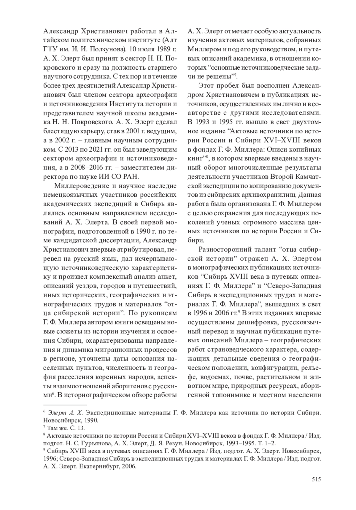 26 ноября 2022 г. не стало Александра Христиановича Элерта – выдающегося ученого, ведущего специалиста в области истории Сибири XVII–XVIII вв., российских академических экспедиций XVIII в., археографии и источниковедения отечественной истории, исторической этнографии и лингвистики коренных народов Сибири. Широкую известность и признание российского и мирового научного сообщества А. Х. Элерт получил благодаря миллероведению – введению в оборот и системному анализу исторических, этнографических, лингвистических, археологических, географических, трудов и материалов комплексного характера из богатейшего научного наследия академика Г. Ф. Миллера, полученных им в ходе и по результатам Второй Камчатской экспедиции (1733–1743) и имеющих фундаментальное значение для истории российской науки и ее отдельных дисциплин.