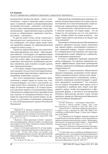 5. Караваев И. В. Пределы судейского усмотрения и правовой критерий как основа юридического метода: теория и практика рассмотрения экономических споров // Труды Ин-та государства и права РАН. 2020. Т. 15, № 5.