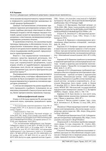 6. Караваев И. В. Субординация требований кредиторов в России в парадигме интегративного правопонимания: краткая история и перспективы развития // Неволинские чтения - 2022. Судебная практика Верховного Суда РФ в отечественной правовой системе: история и современность: сб. докладов Междунар. науч.-практ. конф. (г. Киров 15 декабря 2022 г.) / Волго-Вятский институт (филиал) ФГБОУ ВО “Московский государственный юридический университет имени О. Е. Кутафина (МГЮА)”. Киров: Аверс, 2022. С. 706-718.