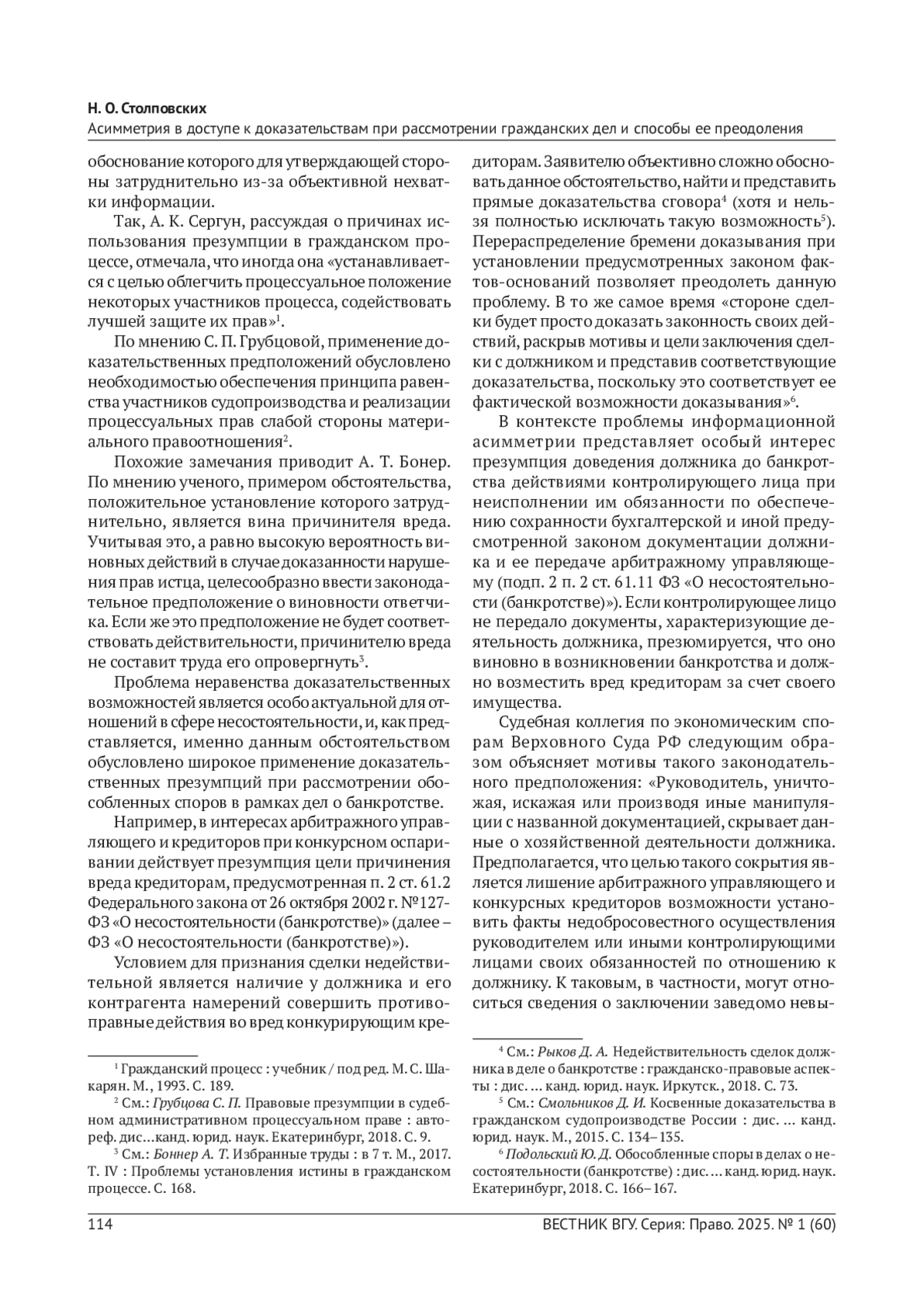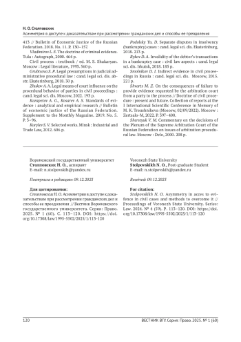 СТОЛПОВСКИХ Н. О. АСИММЕТРИЯ В ДОСТУПЕ К ДОКАЗАТЕЛЬСТВАМ ПРИ РАССМОТРЕНИИ ГРАЖДАНСКИХ ДЕЛ И СПОСОБЫ ЕЕ ПРЕОДОЛЕНИЯ // ВЕСТНИК ВОРОНЕЖСКОГО ГОСУДАРСТВЕННОГО УНИВЕРСИТЕТА. СЕРИЯ: ПРАВО. 2025. № 1 (60)