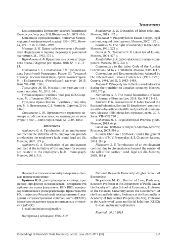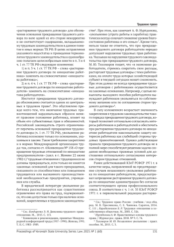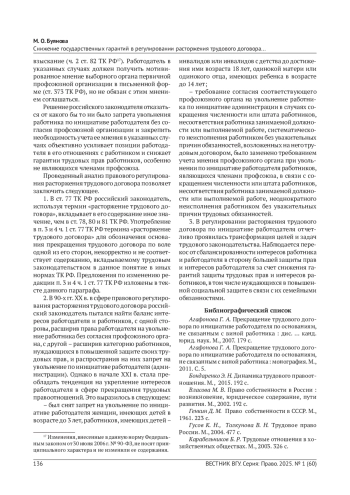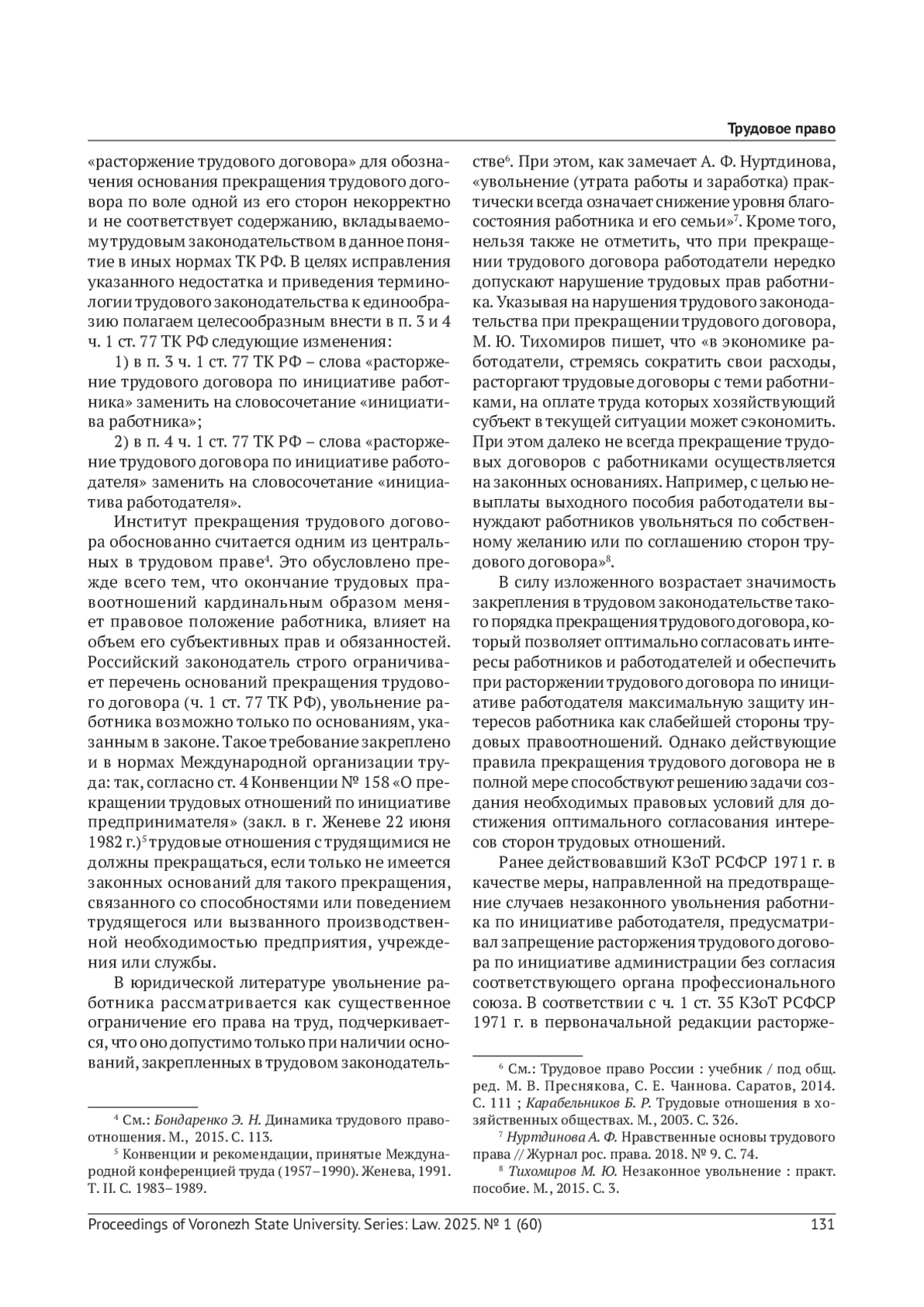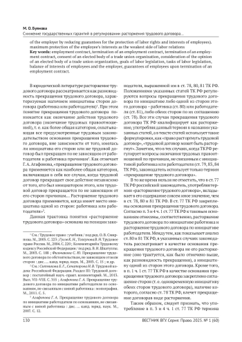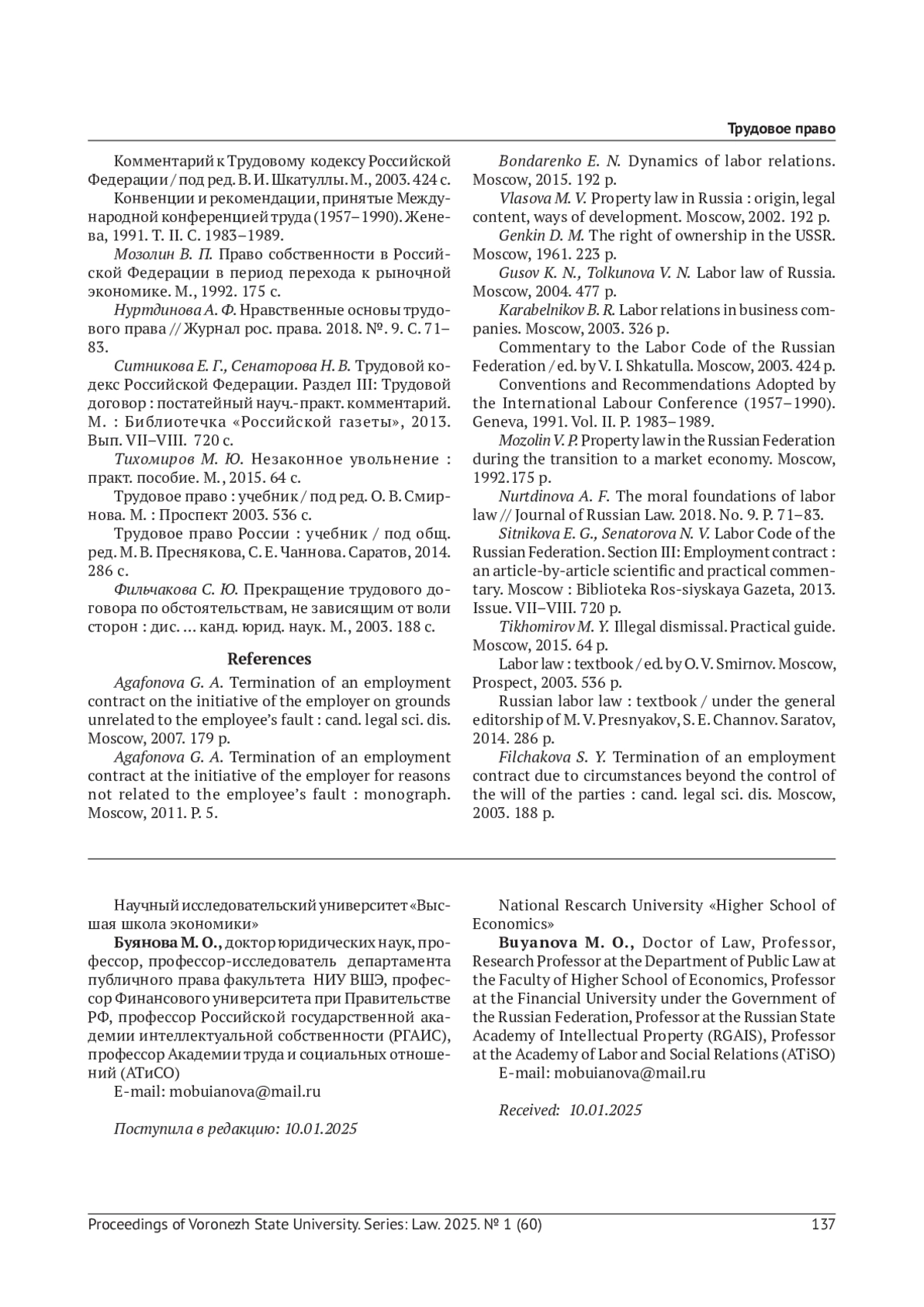 БУЯНОВА М.О. СНИЖЕНИЕ ГОСУДАРСТВЕННЫХ ГАРАНТИЙ В РЕГУЛИРОВАНИИ РАСТОРЖЕНИЯ ТРУДОВОГО ДОГОВОРА ПО ИНИЦИАТИВЕ РАБОТОДАТЕЛЯ // ВЕСТНИК ВОРОНЕЖСКОГО ГОСУДАРСТВЕННОГО УНИВЕРСИТЕТА. СЕРИЯ: ПРАВО. 2025. № 1 (60)