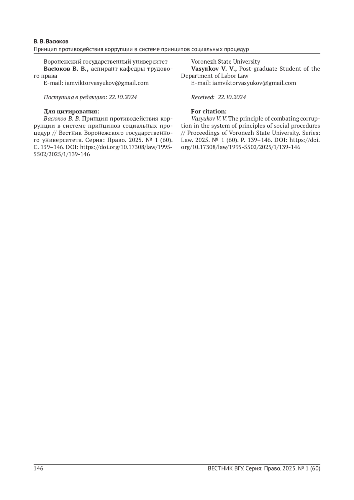 Коррупция - одна из главных проблем современного мира. Разные страны разработали антикоррупционное законодательство, исключением не является и Россия. В связи с этим различными учеными выделяется принцип противодействия коррупции, который в данной статье рассматривается в системе принципов социальных процедур. Исследовано российское законодательство по борьбе с коррупцией в сфере права социального обеспечения, затронуты нормы трудового права, касающиеся работников Фонда пенсионного и социального страхования РФ, рассмотрено законодательство Республики Беларусь и Республики Казахстан в сфере противодействия коррупции, сделан вывод о возможности использования норм зарубежного законодательства в российском праве, изучена правовая природа принципа противодействия коррупции на основании судебных актов Судебной коллегии по административным делам Верховного Суда РФ, Судебной коллегии по гражданским делам Верховного Суда РФ и трудов исследователей в сфере противодействия коррупции.