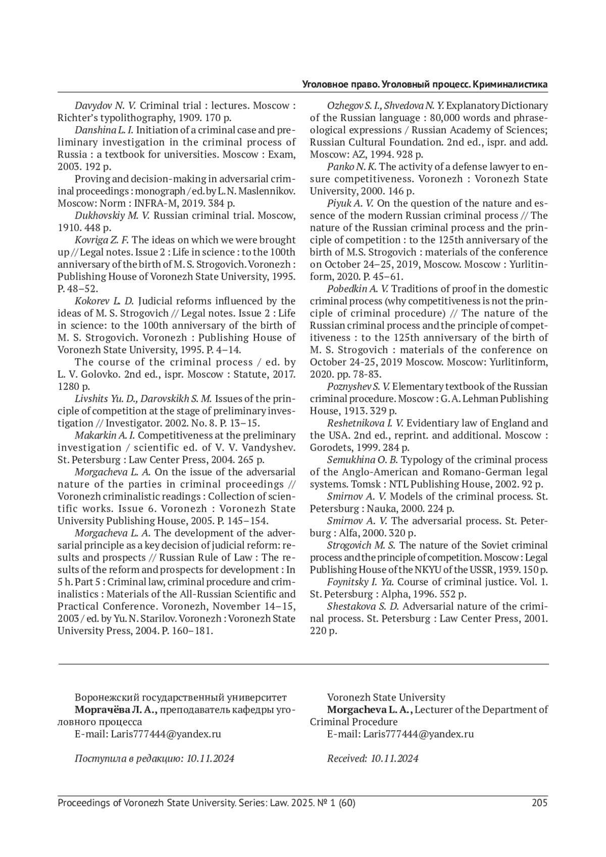 17. Моргачёва Л. А. К вопросу о состязательности сторон в уголовном судопроизводстве // Воронежские криминалистические чтения: сб. науч. трудов. Воронеж: Изд-во Воронеж. гос. ун-та, 2005. Вып. 6. С. 145-154.