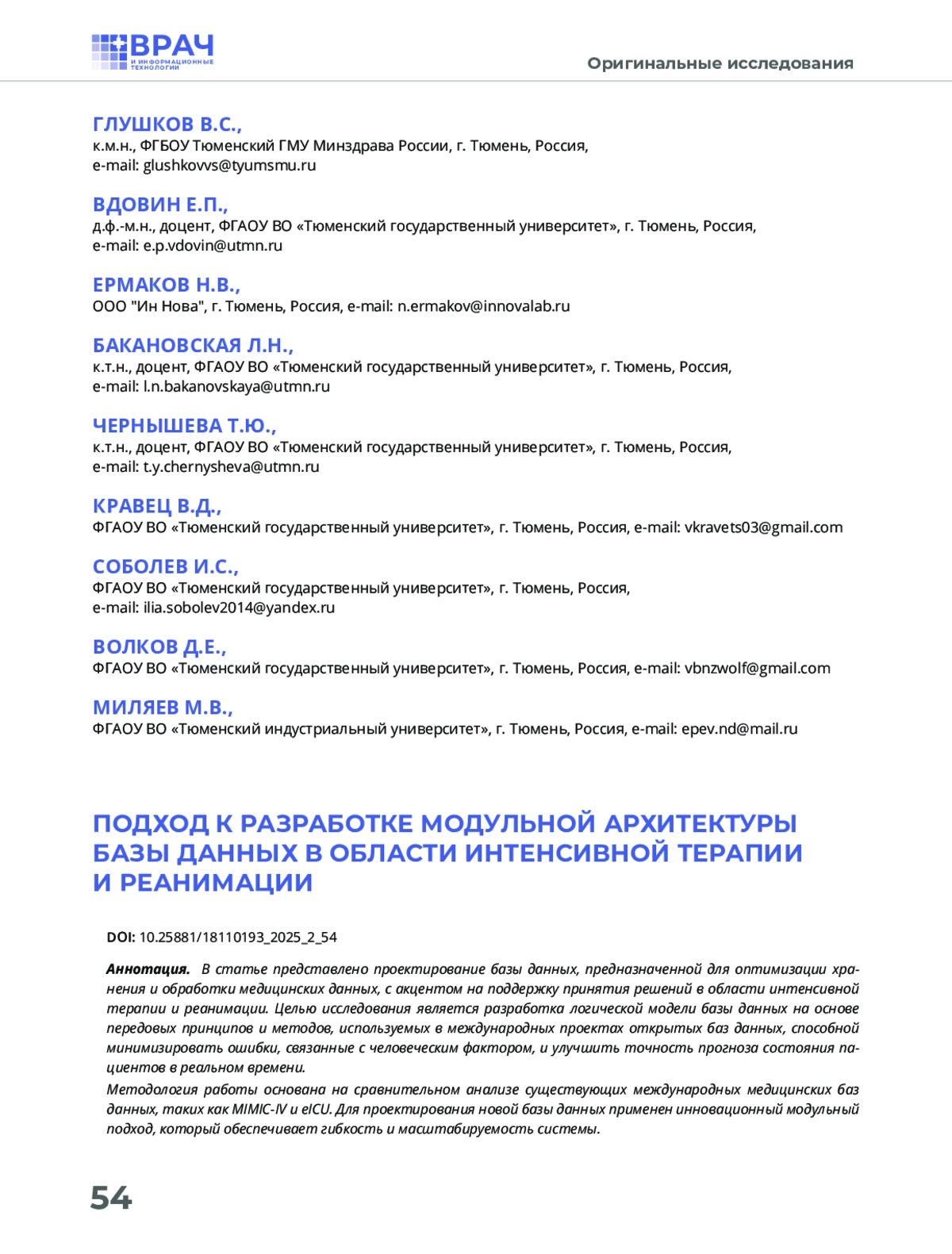 Методология работы основана на сравнительном анализе существующих международных медицинских баз данных, таких как MIMIC-IV и eICU. Для проектирования новой базы данных применен инновационный модульный подход, который обеспечивает гибкость и масштабируемость системы.