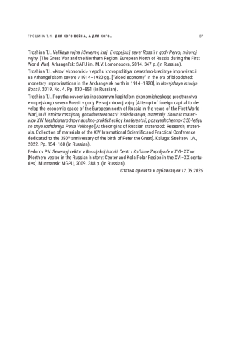 33. Troshina T.I. Velikaya vojna i Severnyj kraj. Evropejskij sever Rossii v gody Pervoj mirovoj vojny. [The Great War and the Northern Region. European North of Russia during the First World War]. Arhangel’sk: SAFU im. M.V. Lomonosova, 2014. 347 p. (in Russian).