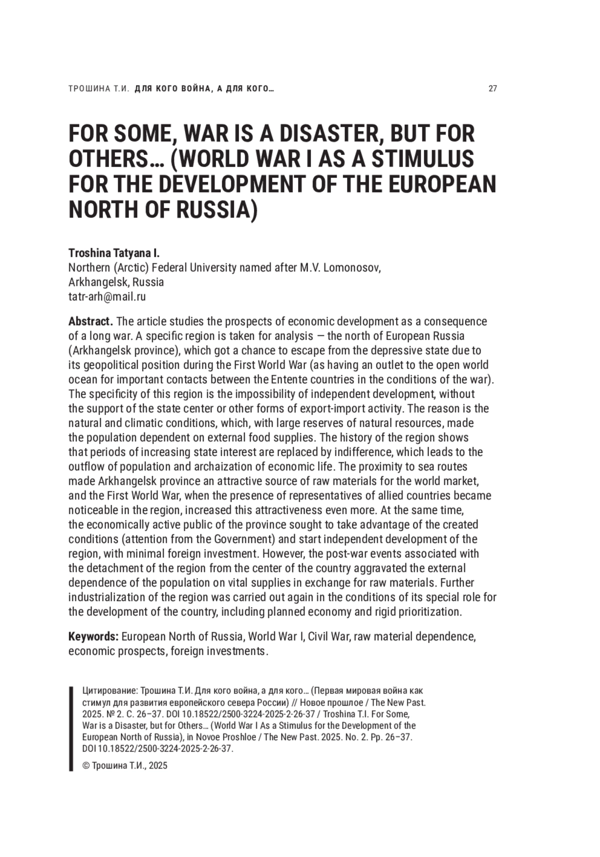 В статье исследуются перспективы экономического развития как последствия длительной войны. Для анализа взят конкретный регион — север европейской России (Архангельская губерния), который получил шанс вырваться из депрессивного состояния в связи со своим геополитическим положением в период Первой мировой войны (как имеющий выход в открытый Мировой океан для важных в условиях войны контактов между странами Антанты). Специфика этого региона заключается в невозможности самостоятельного развития без решающей поддержки государственного центра. Немалую долю в поддержании местной экономики играли и различные формы экспортно-импортной деятельности, связывающие Архангельскую губернию с центральными районами России и отдельными европейскими странами. Причина — в природно-климатических условиях, которые, при больших запасах природных ресурсов, делали население зависимым от внешнего подвоза продовольствия. История региона показывает, что периоды возрастания государственного интереса сменяются равнодушием, что ведет к оттоку населения и архаизации хозяйственной жизни. Близость к морским путям сделала Архангельскую губернию привлекательным источником сырья для мирового рынка, а Первая мировая война, когда в регионе заметным стало присутствие представителей стран-союзниц, эта привлекательность еще более возросла. При этом экономически активная общественность губернии стремилась воспользоваться создавшимися условиями (вниманием со стороны правительства) и приступить к самостоятельному развитию региона, при минимальном привлечении иностранных инвестиций. Однако послевоенные события, связанные с отрывом региона от центра страны, усугубили внешнюю зависимость населения от жизненно необходимых поставок в обмен на сырье. Дальнейшая индустриализация региона осуществлялась вновь в условиях особой его роли для развития страны и в качестве необходимых мер включала плановое ведение хозяйства и жесткую расстановку приоритетов