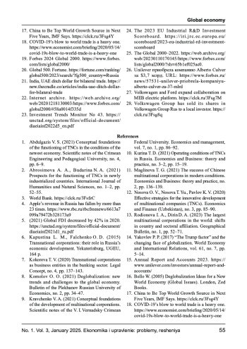 13. Родионова И. А., Дирин Д. А. Крупнейшие транснациональные корпорации мира: сдвиги в страновой и секторальной принадлежности // Географический вестник. 2023. № 1. С. 52-71. EDN: LWOZKF