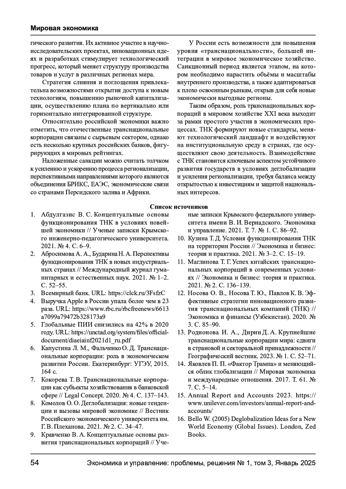 1. Абдулгазис В. С. Концептуальные основы функционирования ТНК в условиях новейшей экономики // Ученые записки Крымского инженерно-педагогического университета. 2021. № 4. С. 6-9. EDN: QKPUPY