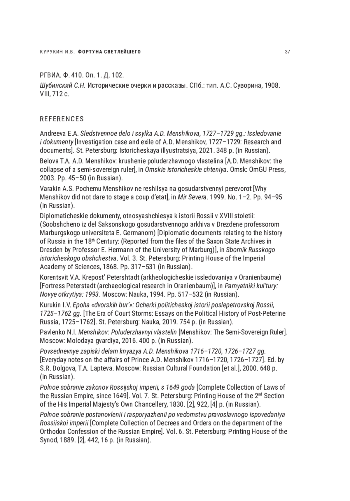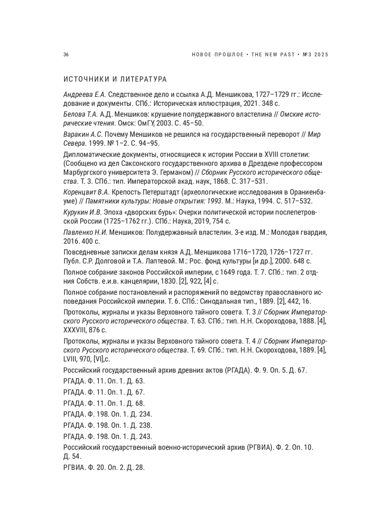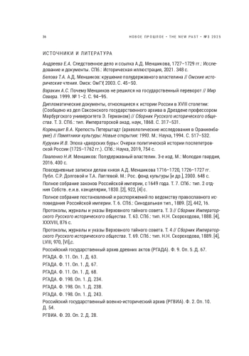 24. Andreeva E.A. Sledstvennoe delo i ssylka A.D. Menshikova, 1727-1729 gg.: Issledovanie i dokumenty [Investigation case and exile of A.D. Menshikov, 1727-1729: Research and documents]. St. Petersburg: Istoricheskaya illyustratsiya, 2021. 348 p. (in Russian).