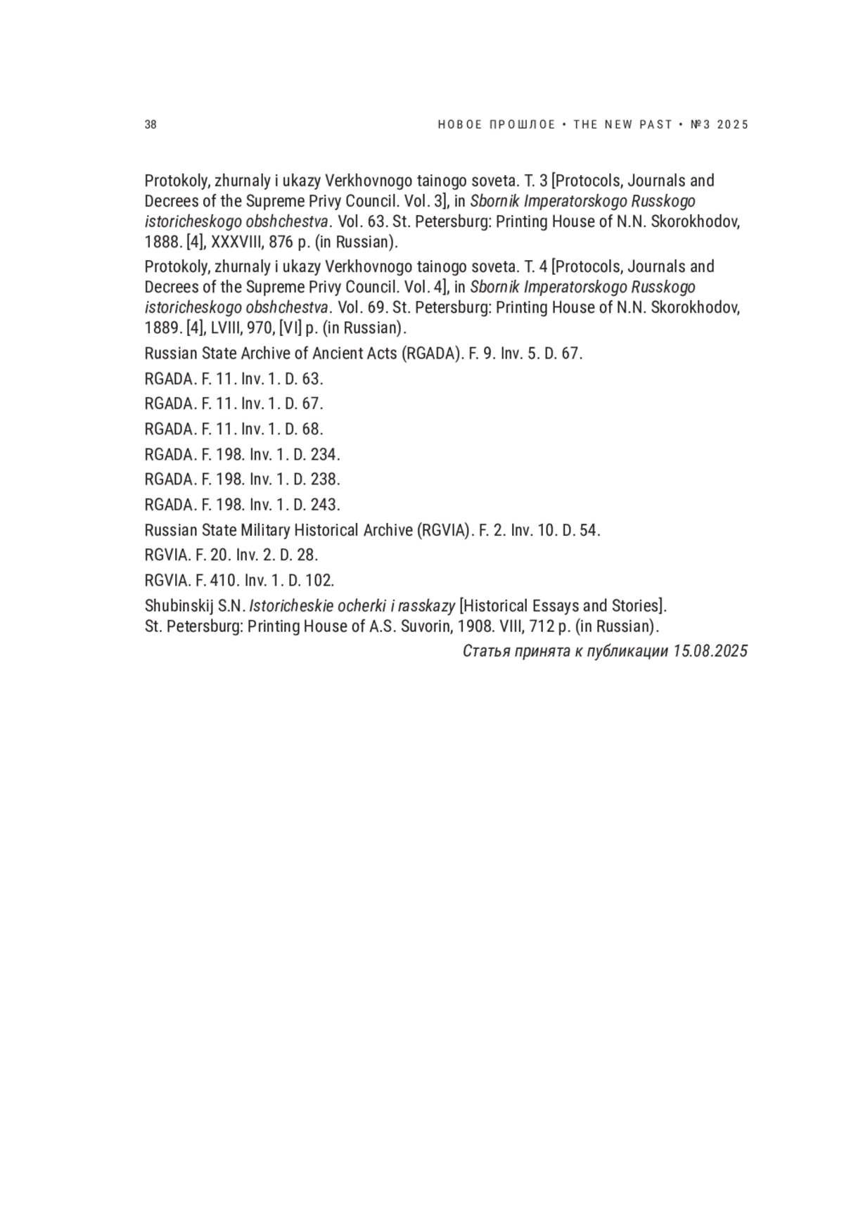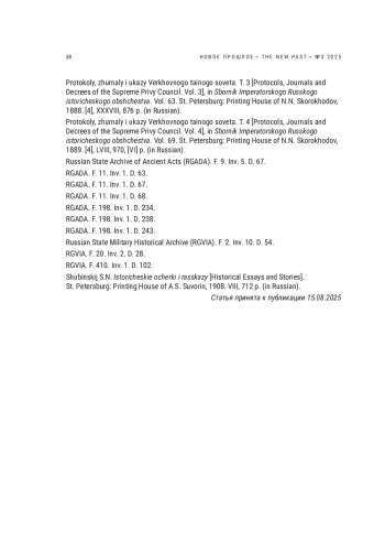 34. Protokoly, zhurnaly i ukazy Verkhovnogo tainogo soveta. T. 3 [Protocols, Journals and Decrees of the Supreme Privy Council. Vol. 3], in Sbornik Imperatorskogo Russkogo istoricheskogo obshchestva. Vol. 63. St. Petersburg: Printing House of N.N. Skorokhodov, 1888. [4], XXXVIII, 876 p. (in Russian).