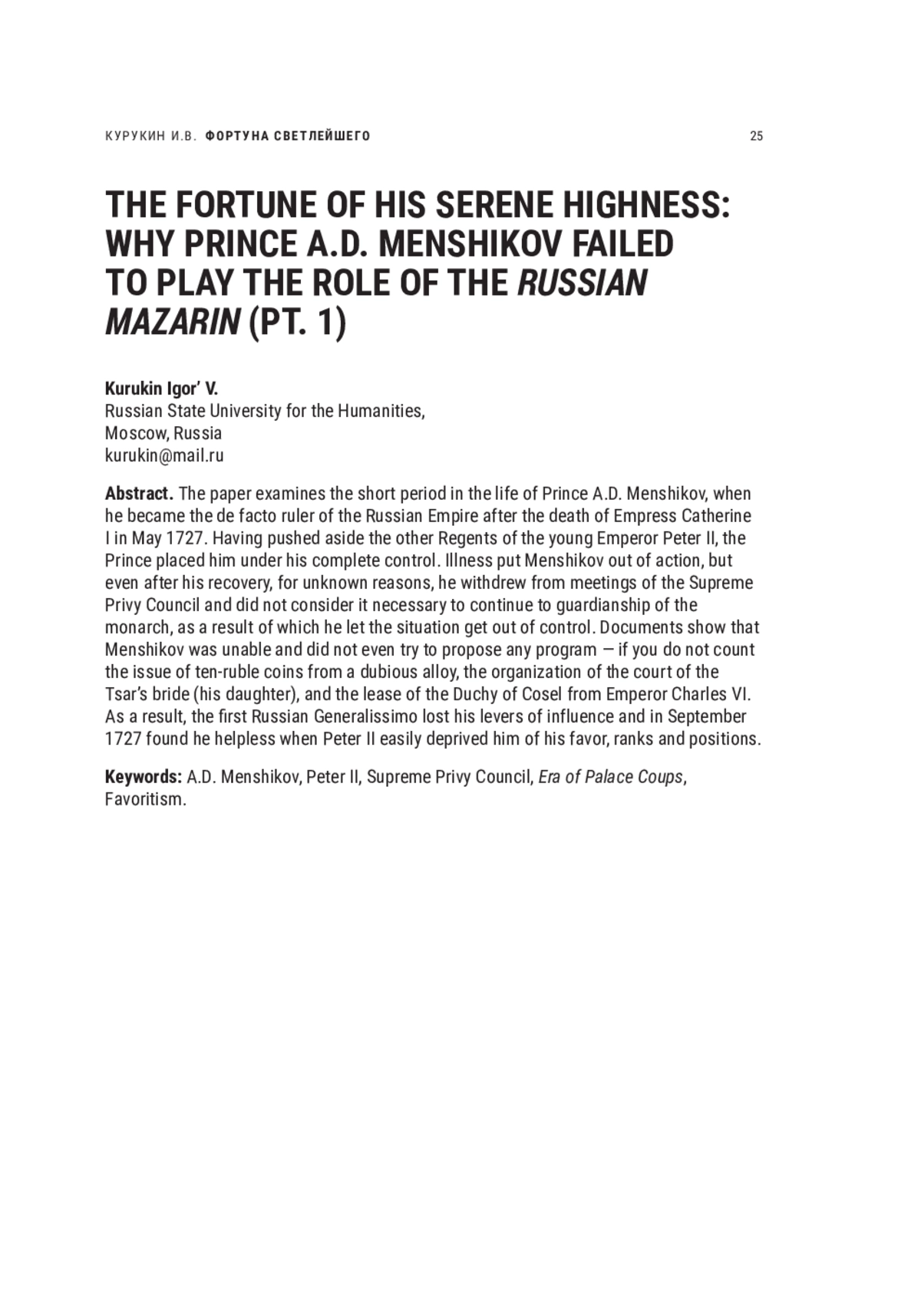 29. Kurukin I.V. Epoha «dvorskih bur’»: Ocherki politicheskoj istorii poslepetrovskoj Rossii, 1725-1762 gg. [The Era of Court Storms: Essays on the Political History of Post-Peterine Russia, 1725-1762]. St. Petersburg: Nauka, 2019. 754 p. (in Russian).