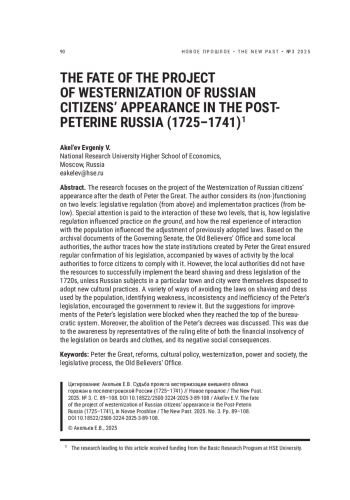 О петровском проекте вестернизации внешнего облика горожан написано немало [см.: Есипов, 1863; Михневич, 1882; Hughes, 2004; Аваков, 2017; Акельев, 2022]. Однако до сих пор почти не исследована судьба этого начинания после того, как в конце января 1725 г. Петр I отошел в мир иной. Между тем рассмотрение этого вопроса представляет особенный интерес для изучения механизмов сохранения его наследия в построенной им империи. Был ли Петр I единственным источником и движущей силой радикальных культурных преобразований? Сохраняли ли ближайшие политические преемники первого российского императора верность его идеям не только на словах, но и на деле? Какую роль в реализации его культурной программы играли созданные им государственные институты? Наконец, каковы были результаты его культурной политики в долгосрочной перспективе?
