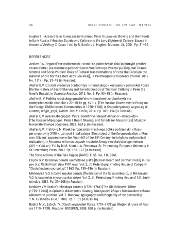 42. Hughes L. «A Beard is an Unnecessary Burden»: Peter I’s Laws on Shaving and their Roots in Early Russia // Russian Society and Culture and the Long Eighteenth Century: Essays in Honour of Anthony G. Cross / ed. by R. Bartlett, L. Hughes. Munster: Lit, 2004. Pp. 21-34.