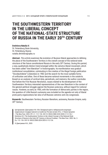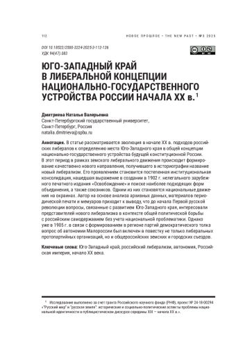 В статье рассматривается эволюция в начале XX в. подходов российских либералов к определению места Юго-Западного края в общей концепции национально-государственного устройства будущей конституционной России. В этот период в рамках земского либерального движения происходит формирование качественно нового направления, получившего в историографии название новый либерализм. Его проявлением становится постепенная институциональная консолидация, нашедшая выражение в создании в 1902 г. нелегального зарубежного печатного издания «Освобождение» и поиске наиболее подходящих форм объединения, а также союзников. Одним из них становятся национальные движения на окраинах. Автор на основе анализа архивных данных, материалов периодической печати и мемуаров приходит к выводу, что до начала Первой русской революции вопросы, связанные с развитием Юго-Западного края, интересовали представителей нового либерализма в контексте общей политической борьбы с российским самодержавием без учета национальной проблематики. Однако уже в 1905 г. в связи с формированием в регионе партий демократического толка вопрос об автономии Малороссии был включен в повестку не только либеральных протопартийных организаций, но и общероссийских земских и городских съездов.