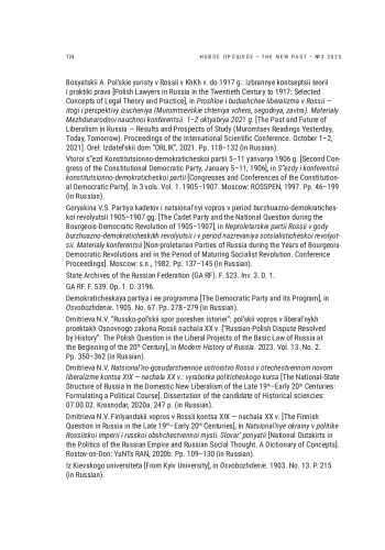 51. Dmitrieva N.V. “Russko-pol’skii spor poreshen istoriei”: pol’skii vopros v liberal’nykh proektakh Osnovnogo zakona Rossii nachala XX v. [“Russian-Polish Dispute Resolved by History”: The Polish Question in the Liberal Projects of the Basic Law of Russia at the Beginning of the 20th Century], in Modern History of Russia. 2023. Vol. 13. No. 2. Pp. 350-362 (in Russian).