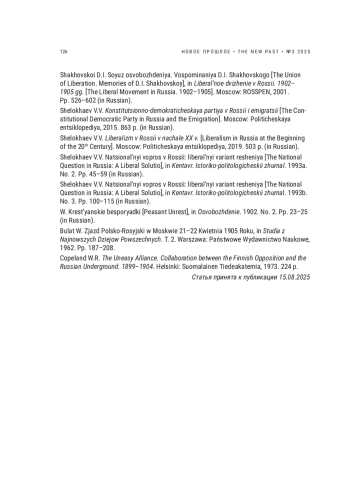 67. Solov’ev K.A. Obshchestvennoe dvizhenie v Rossii. 1891-1905 gg. [Social Movement in Russia. 1891-1905]. Moscow: Nasledie, 2024. 520 p. (in Russian).