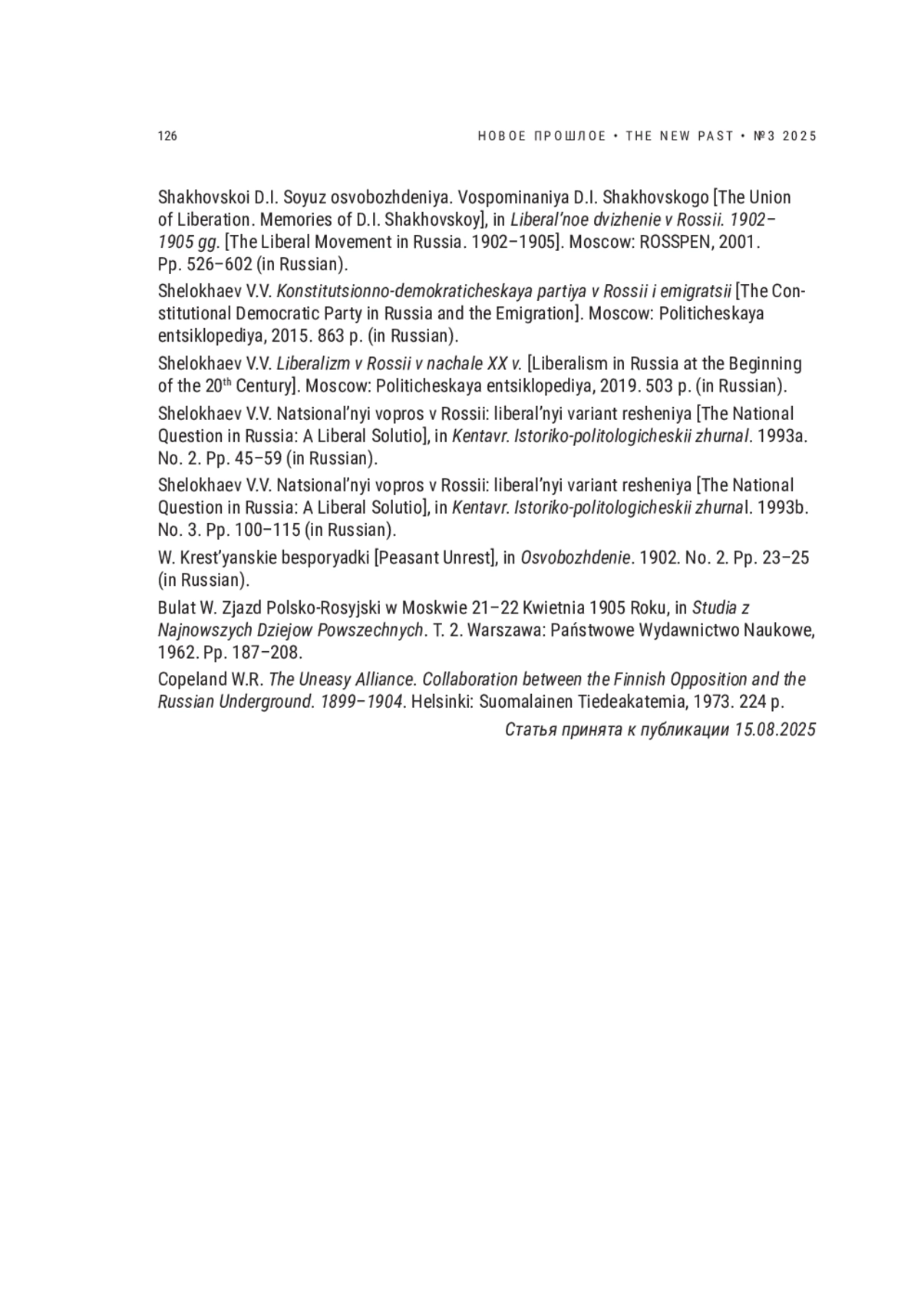 71. Shakhovskoi D.I. Soyuz osvobozhdeniya. Vospominaniya D.I. Shakhovskogo [The Union of Liberation. Memories of D.I. Shakhovskoy], in Liberal’noe dvizhenie v Rossii. 1902-1905 gg. [The Liberal Movement in Russia. 1902-1905]. Moscow: ROSSPEN, 2001. Pp. 526-602 (in Russian).
