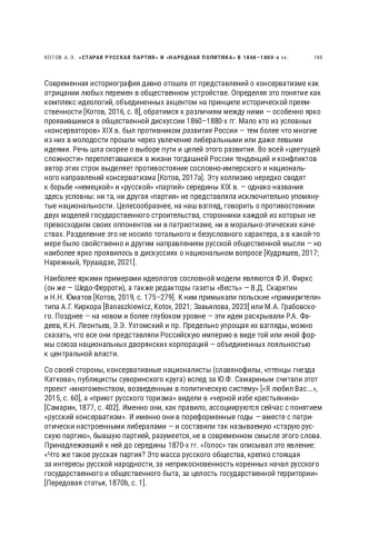 Современная историография давно отошла от представлений о консерватизме как отрицании любых перемен в общественном устройстве. Определяя это понятие как комплекс идеологий, объединенных акцентом на принципе исторической преемственности [Котов, 2016, с. 8], обратимся к различиям между ними — особенно ярко проявившимся в общественной дискуссии 1860–1880-х гг. Мало кто из условных «консерваторов» XIX в. был противником развития России — тем более что многие из них в молодости прошли через увлечение либеральными или даже левыми идеями. Речь шла скорее о выборе пути и целей этого развития. Во всей «цветущей сложности» переплетавшихся в жизни тогдашней России тенденций и конфликтов автор этих строк выделяет противостояние сословно-имперского и национального направлений консерватизма [Котов, 2017a].