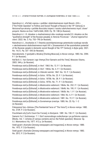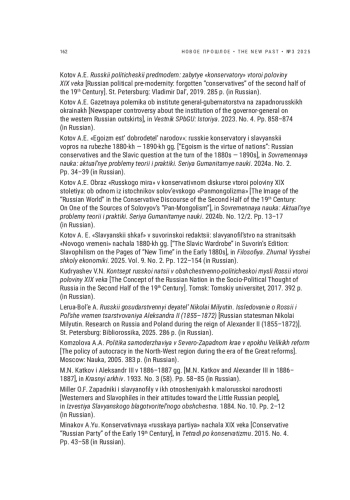 65. Kotov A.E. «Egoizm est’ dobrodetel’ narodov»: russkie konservatory i slavyanskii vopros na rubezhe 1880-kh - 1890-kh gg. [“Egoism is the virtue of nations”: Russian conservatives and the Slavic question at the turn of the 1880s - 1890s], in Sovremennaya nauka: aktual’nye problemy teorii i praktiki. Seriya Gumanitarnye nauki. 2024a. No. 2. Pp. 34-39 (in Russian).