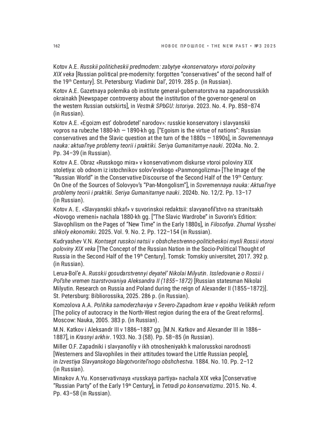 60. Kotov A.E. «Tsarskii put’» Mikhaila Katkova: Ideologiya byurokraticheskogo natsionalizma v politicheskoi publitsistike 1860-1890-kh godov [“The Tsar’s Path” by Mikhail Katkov: The Ideology of Bureaucratic Nationalism in Political Journalism of the 1860-1890s]. St. Petersburg: Vladimir Dal’, 2016. 487 p. (in Russian).