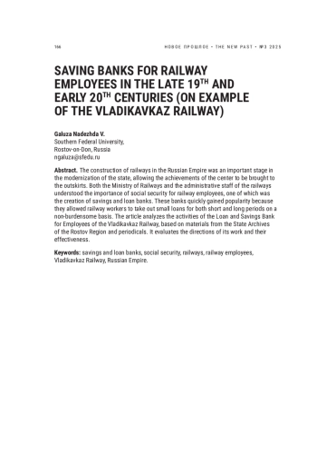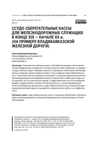 Строительство железных дорог в Российской империи стало важным этапом модернизации государства. И в министерстве путей сообщения, и в администрации железных дорог понимали важность социального обеспечения железнодорожных служащих, одной из форм которого стало создание ссудо-сберегательных касс. Такие кассы быстро завоевали популярность, поскольку давали возможность железнодорожникам на необременительных условиях брать небольшие ссуды как на короткий, так и на длительный период. В представленной статье на материалах фондов Государственного архива Ростовской области, а также периодической печати анализируется деятельность ссудо-сберегательной кассы служащих Владикавказской железной дороги, оцениваются направления ее работы и их эффективность
