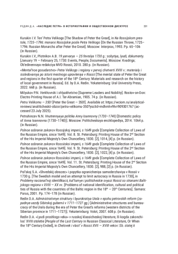 34. Kurukin I.V. Ten’ Petra Velikogo [The Shadow of Peter the Great], in Na Rossijskom prestole, 1725-1796: monarxi Rossijskie posle Petra Velikogo [On the Russian Throne, 1725-1796: Russian Monarchs after Peter the Great]. Moscow: Interprax, 1993. Pp. 65-106 (in Russian).