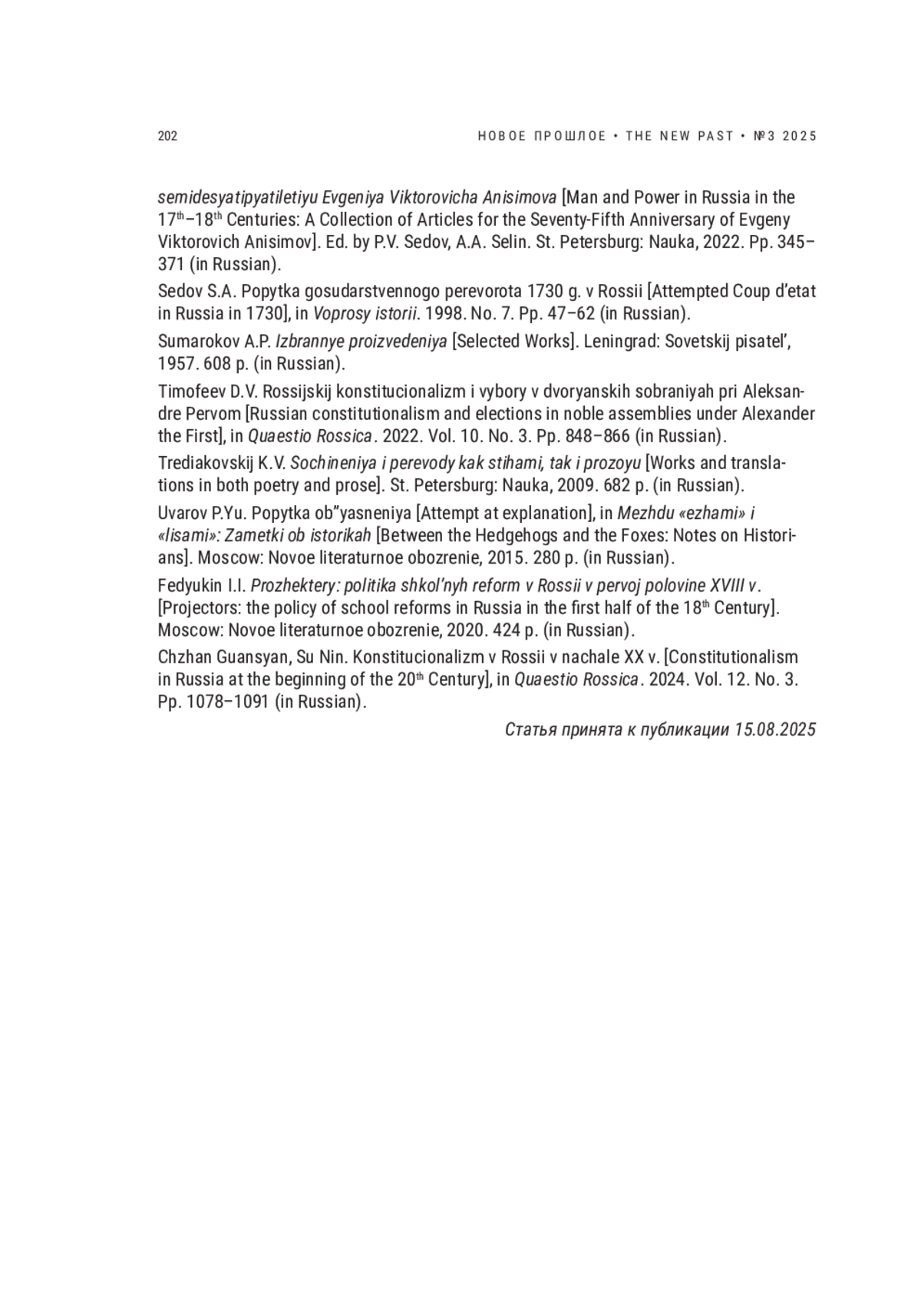 45. Redin D.A. «Lyudi proshlogo veka» v russkoj klassicheskoj literature, Ili kogda zakonchilos’ XVIII stoletie [People of the Last Century in Russian Classical Literature, Or When the 18th Century Ended], in Chelovek i vlast’ v Rossii XVII - XVIII vekov: Sb. statej k semidesyatipyatiletiyu Evgeniya Viktorovicha Anisimova [Man and Power in Russia in the 17th-18th Centuries: A Collection of Articles for the Seventy-Fifth Anniversary of Evgeny Viktorovich Anisimov]. Ed. by P.V. Sedov, A.A. Selin. St. Petersburg: Nauka, 2022. Pp. 345-371 (in Russian).