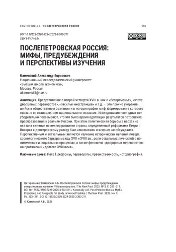 Тема «наследия Петра» стала актуальна как для политического дискурса России после смерти реформатора, так и для формирования дальнейшего политического курса как такового. Если идеологическая составляющая начинает особенно сфокусировано проявлять себя с момента прихода к власти Елизаветы Петровны и именно в ее царствование обретает содержательную полноту, то текущие проблемы побуждают преемников первого императора определиться по отношению к его преобразованиям буквально с первых дней «жизни без Петра». Выражая солидарность с выводами ряда современных историков, автор оценивает постпетровский период истории России как, в целом, продолжение его начинаний, лишь избавленных от одиозных крайностей. При этом отмечается, что сам концепт «петровского наследия», уйдя из актуальной политической повестки к рубежу XVIII — XIX вв. в сферу различных форм национальных коммемораций, по-разному воспринимался и воспринимается в научном историческом знании и в общественном сознании большинства. Если историография преодолела многие мифы о постпетровской России, то в общественно-политическом дискурсе они живут в формах, восходящих еще к временам елизаветинской пропаганды. Оставляя вопрос о связях двух форм исторического знания (научном и массовом) для отдельной дискуссии, автор отмечает необходимость более глубокого изучения базовых составляющих социально-экономической и культурной жизни России XVIII в., необходимость разворота исследовательских усилий от «страстей у трона» к процессам, протекавшим «на земле», с учетом их разнородности, определяемой региональной и социальной неоднородностью империи. По мнению автора, именно на базе такого нового эмпирического знания возможно корректное построение новых обобщающих концепций отечественной истории этой эпохи