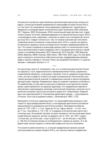 Тема «наследия Петра» стала актуальна как для политического дискурса России после смерти реформатора, так и для формирования дальнейшего политического курса как такового. Если идеологическая составляющая начинает особенно сфокусировано проявлять себя с момента прихода к власти Елизаветы Петровны и именно в ее царствование обретает содержательную полноту, то текущие проблемы побуждают преемников первого императора определиться по отношению к его преобразованиям буквально с первых дней «жизни без Петра». Выражая солидарность с выводами ряда современных историков, автор оценивает постпетровский период истории России как, в целом, продолжение его начинаний, лишь избавленных от одиозных крайностей. При этом отмечается, что сам концепт «петровского наследия», уйдя из актуальной политической повестки к рубежу XVIII — XIX вв. в сферу различных форм национальных коммемораций, по-разному воспринимался и воспринимается в научном историческом знании и в общественном сознании большинства. Если историография преодолела многие мифы о постпетровской России, то в общественно-политическом дискурсе они живут в формах, восходящих еще к временам елизаветинской пропаганды. Оставляя вопрос о связях двух форм исторического знания (научном и массовом) для отдельной дискуссии, автор отмечает необходимость более глубокого изучения базовых составляющих социально-экономической и культурной жизни России XVIII в., необходимость разворота исследовательских усилий от «страстей у трона» к процессам, протекавшим «на земле», с учетом их разнородности, определяемой региональной и социальной неоднородностью империи. По мнению автора, именно на базе такого нового эмпирического знания возможно корректное построение новых обобщающих концепций отечественной истории этой эпохи