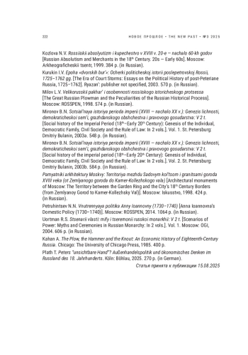27. Kozlova N.V. Rossiiskii absolyutizm i kupechestvo v XVIII v. 20-e - nachalo 60-kh godov [Russian Absolutism and Merchants in the 18th Century. 20s - Early 60s]. Moscow: Arkheograficheskii tsentr, 1999. 384 p. (in Russian).