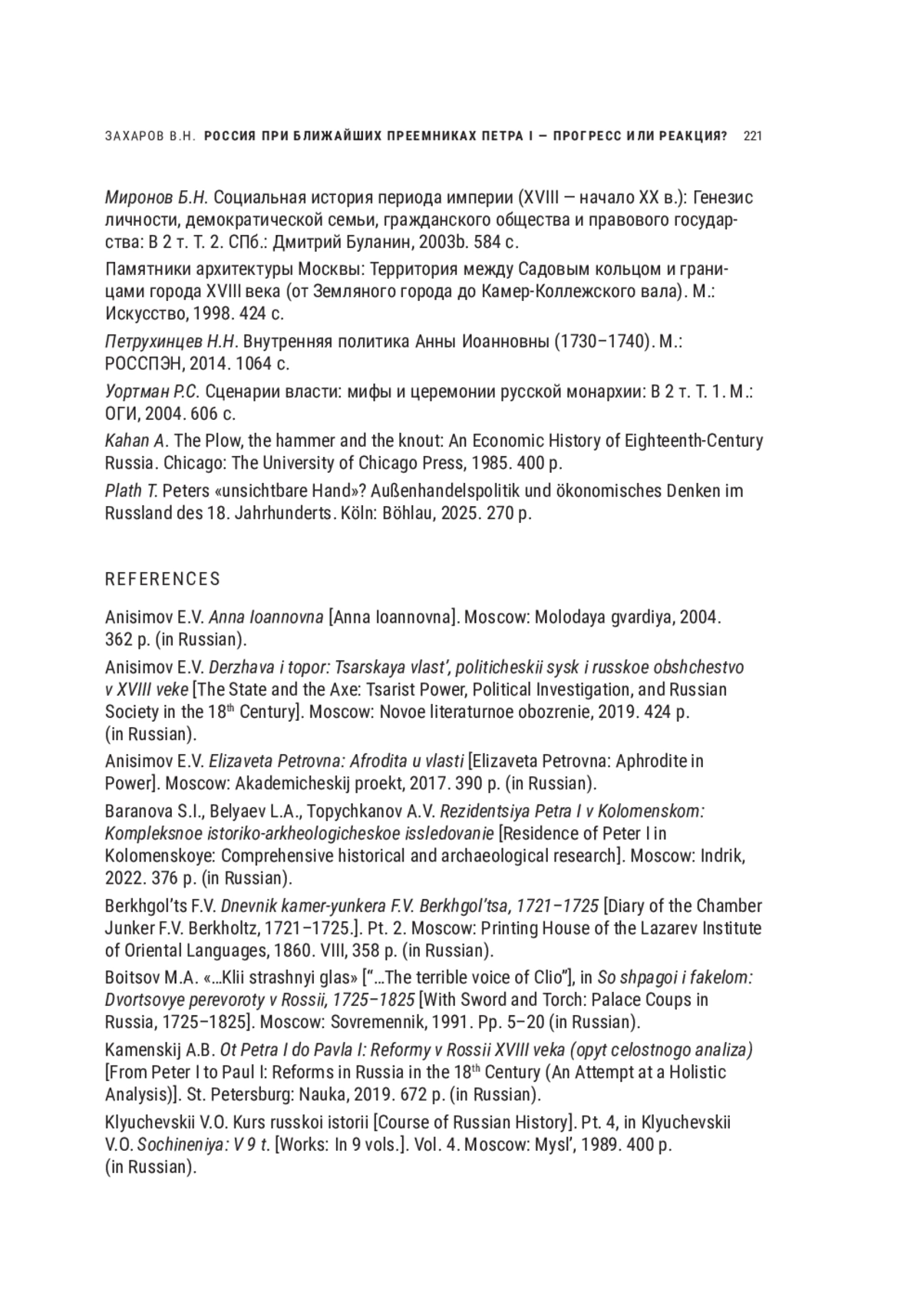 25. Kamenskij A.B. Ot Petra I do Pavla I: Reformy v Rossii XVIII veka (opyt celostnogo analiza) [From Peter I to Paul I: Reforms in Russia in the 18th Century (An Attempt at a Holistic Analysis)]. St. Petersburg: Nauka, 2019. 672 p. (in Russian).