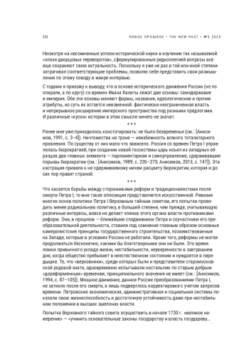 В оценке послепетровской эпохи автор заостряет внимание на основаниях исторического движения России — самодержавии и империи. Истоки дворцовых переворотов предлагается искать в сущности самого самодержавия, вышедшего из правового поля в период правления Петра I. Отказываясь считать 1725–1762 гг. «безвременьем», автор обращает внимание на расцвет бюрократии, порожденной петровскими реформами. Отмечается искусственность разделения политической элиты, оказавшейся во главе имперского правительства после смерти Петра I, на сторонников и противников его реформ. Констатируется, что ревизии подверглись прежде всего заимствованные на Западе камералистские принципы государственного строительства, не работавшие в условиях России. Ставится под сомнение бифуркационное значение попытки Верховного тайного совета ограничить самодержавие в 1730 г. Решать принципиальные вопросы о пределах самодержавной власти в России «верховники» и представители дворянского движения были не готовы. С другой стороны, сформулированные тогда дворянством социальные запросы оказали влияние на последующий внутриполитический курс Анны Иоанновны и послужили катализатором эмансипации сословия. По мнению автора, личность этой императрицы, без которой не было бы «Петербургского периода» русской культуры, нуждается в переоценке