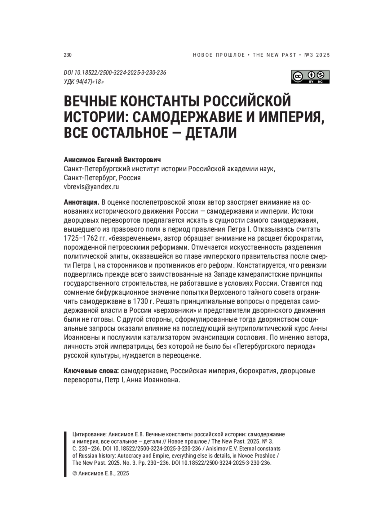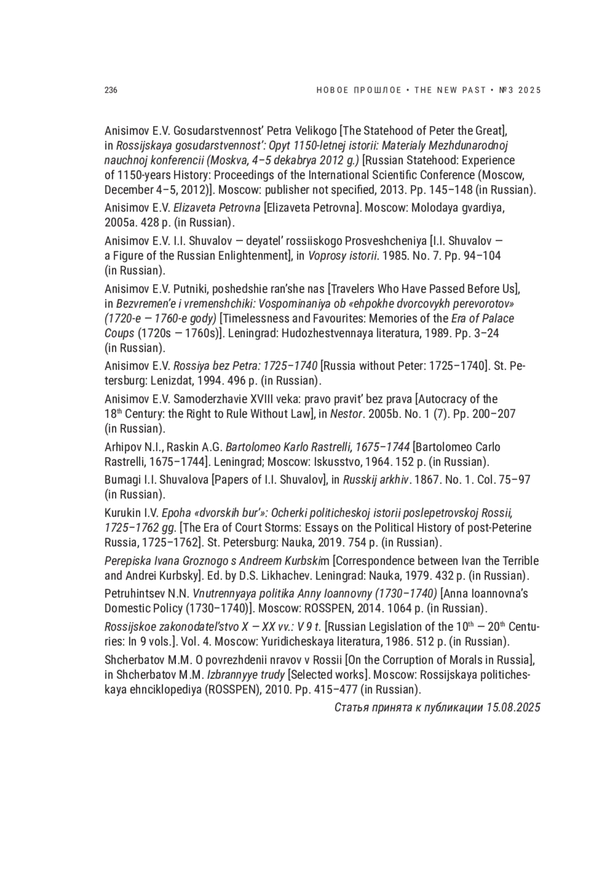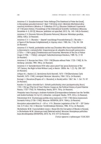 23. Anisimov E.V. Samoderzhavie XVIII veka: pravo pravit’ bez prava [Autocracy of the 18th Century: the Right to Rule Without Law], in Nestor. 2005b. No. 1 (7). Рр. 200-207 (in Russian).