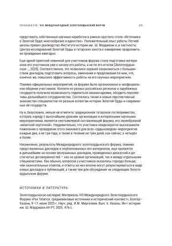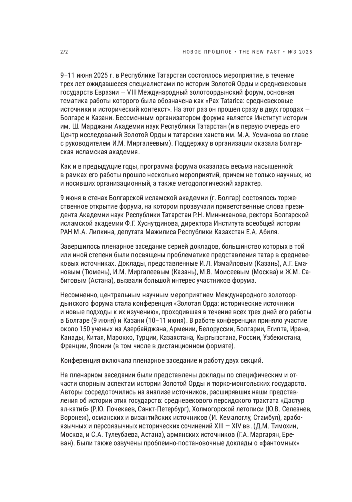 2. Zolotoordynskoe nasledie: Materialy VIIΙ Mezhdunarodnogo Zolotoordynskogo Foruma «Pax Tatarica: srednevekovye istochniki i istoricheskiy kontekst» [Golden Horde legacy: Materials of the VIII International Golden Horde Forum “Pax Tatarica: Medieval Sources and Historical Context”], Bolgar-Kazan, June 9-11, 2025. Iss. 6. Ed. by I.M. Mirgaleev. Kazan: Marjani Institute of History of the Tatarstan Academy of Sciences, 2025. 476 p. (in Russian).