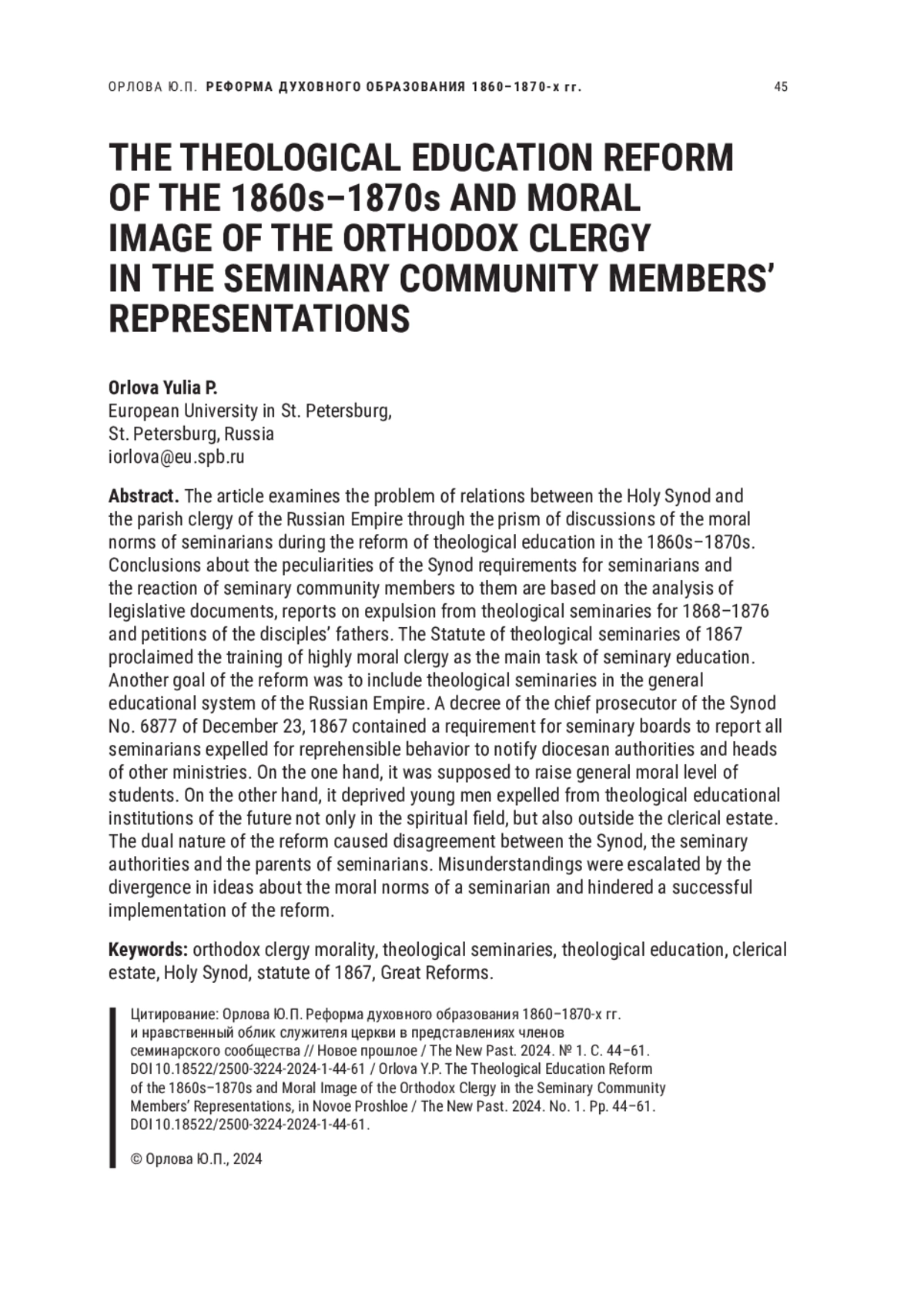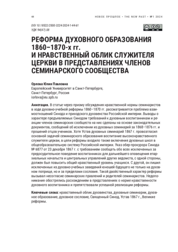 Период преобразований Александра II обоснованно считается временем масштабных социальных изменений, затронувших практически все слои российского общества. Не стало исключением и духовное сословие. В историографии принято рассматривать духовно-учебную реформу 1860–1870 гг. в контексте либерализации образования и попытки ликвидации сословной замкнутости духовенства. При этом в фокусе историков оказываются прежде всего изменения учебного процесса и социального положения преподавателей и воспитанников [Freeze, 1983; Римский, 1999; Сушко, 2010; Федоров, 2001].