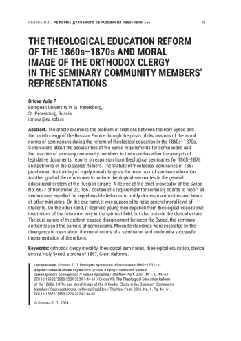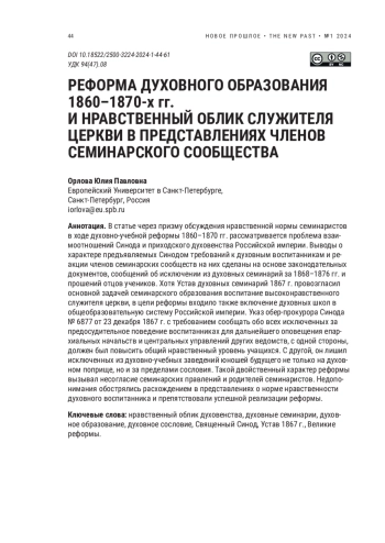 В статье через призму обсуждения нравственной нормы семинаристов в ходе духовно-учебной реформы 1860–1870 гг. рассматривается проблема взаимоотношений Синода и приходского духовенства Российской империи. Выводы о характере предъявляемых Синодом требований к духовным воспитанникам и реакции членов семинарских сообществ на них сделаны на основе законодательных документов, сообщений об исключении из духовных семинарий за 1868–1876 гг. и прошений отцов учеников. Хотя Устав духовных семинарий 1867 г. провозгласил основной задачей семинарского образования воспитание высоконравственного служителя церкви, в цели реформы входило также включение духовных школ в общеобразовательную систему Российской империи. Указ обер-прокурора Синода No 6877 от 23 декабря 1867 г. с требованием сообщать обо всех исключенных за предосудительное поведение воспитанниках для дальнейшего оповещения епархиальных начальств и центральных управлений других ведомств, с одной стороны, должен был повысить общий нравственный уровень учащихся. С другой, он лишил исключенных из духовно-учебных заведений юношей будущего не только на духовном поприще, но и за пределами сословия. Такой двойственный характер реформы вызывал несогласие семинарских правлений и родителей семинаристов. Недопонимания обострялись расхождением в представлениях о норме нравственности духовного воспитанника и препятствовали успешной реализации реформы