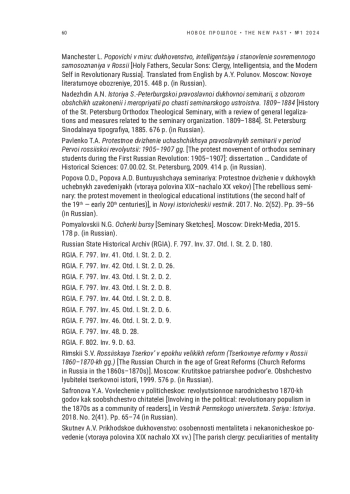 7. Попова О.Д., Попова А.Д. Бунтующая семинария: Протестное движение в духовых учебных заведениях (вторая половина XIX - начало XX веков) // Новый исторический вестник. 2017. № 2 (52). С. 39-56. EDN: ZPDYTD