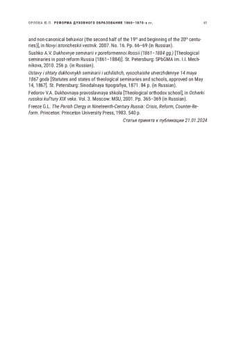1. Горячева А.А. Вопросы воспитания в уставах духовных семинарий 1814 и 1867 гг. // Вестник Православного Свято-Тихоновского гуманитарного университета. Серия 4: Педагогика. Психология. 2010. № 16. С. 50-62. EDN: LBDOKF