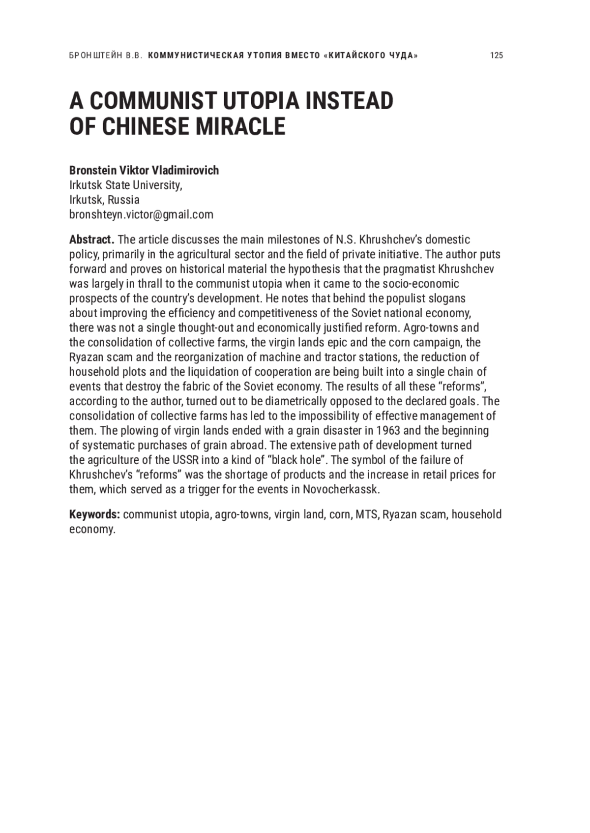 В статье рассматриваются основные вехи внутренней политики Н. С. Хрущева, прежде всего в аграрной сфере и области частной инициативы. Автор выдвигает и на историческом материале доказывает гипотезу, что прагматик Хрущев в значительной степени находился в плену коммунистической утопии, когда речь заходила о социально-экономических перспективах развития страны. За популистскими лозунгами о повышении эффективности и конкурентоспособности советского народного хозяйства не стояло ни одной продуманной и экономически обоснованной реформы. В единую цепочку мероприятий, разрушающих ткань советской экономики, выстраиваются агрогорода и укрупнение колхозов, целинная эпопея и кукурузная кампания, «рязанская афера» и реорганизация машинно-тракторных станций, сокращение приусадебных участков и ликвидация кооперации. Итоги всех этих «реформ», по мнению автора, оказались диаметрально противоположными декларированным целям. Укрупнение колхозов привело к невозможности эффективного управления ими. Распашка целины завершилась зерновой катастрофой в 1963 г. и началом систематических закупок зерна за границей. Экстенсивный путь развития превратил сельское хозяйство СССР в своеобразную «черную дыру». Символом провала хрущевских «реформ» стали дефицит продуктов и повышение розничных цен на них, что послужило спусковым механизмом к событиям в Новочеркасске.