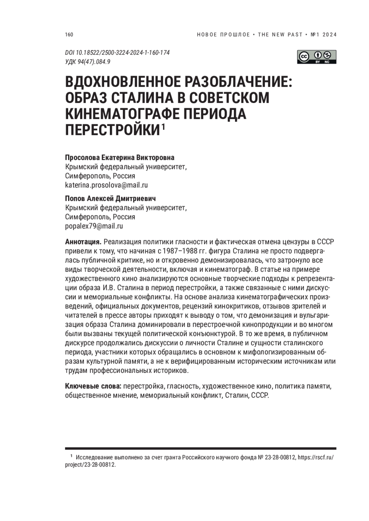 Реализация политики гласности и фактическая отмена цензуры в СССР привели к тому, что начиная с 1987–1988 гг. фигура Сталина не просто подвергалась публичной критике, но и откровенно демонизировалась, что затронуло все виды творческой деятельности, включая и кинематограф. В статье на примере художественного кино анализируются основные творческие подходы к репрезентации образа И. В. Сталина в период перестройки, а также связанные с ними дискуссии и мемориальные конфликты. На основе анализа кинематографических произведений, официальных документов, рецензий кинокритиков, отзывов зрителей и читателей в прессе авторы приходят к выводу о том, что демонизация и вульгаризация образа Сталина доминировали в перестроечной кинопродукции и во многом были вызваны текущей политической конъюнктурой. В то же время, в публичном дискурсе продолжались дискуссии о личности Сталине и сущности сталинского периода, участники которых обращались в основном к мифологизированным образам культурной памяти, а не к верифицированным историческим источникам или трудам профессиональных историков