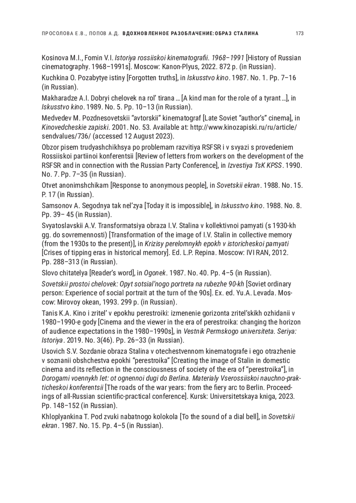 26. Усович С.В. Создание образа Сталина в отечественном кинематографе и его отражение в сознании общества эпохи “перестройки” // Дорогами военных лет: от огненной дуги до Берлина. Материалы Всероссийской научно-практической конференции. Курск: Университетская книга, 2023. С. 148-152. EDN: VVEFRW