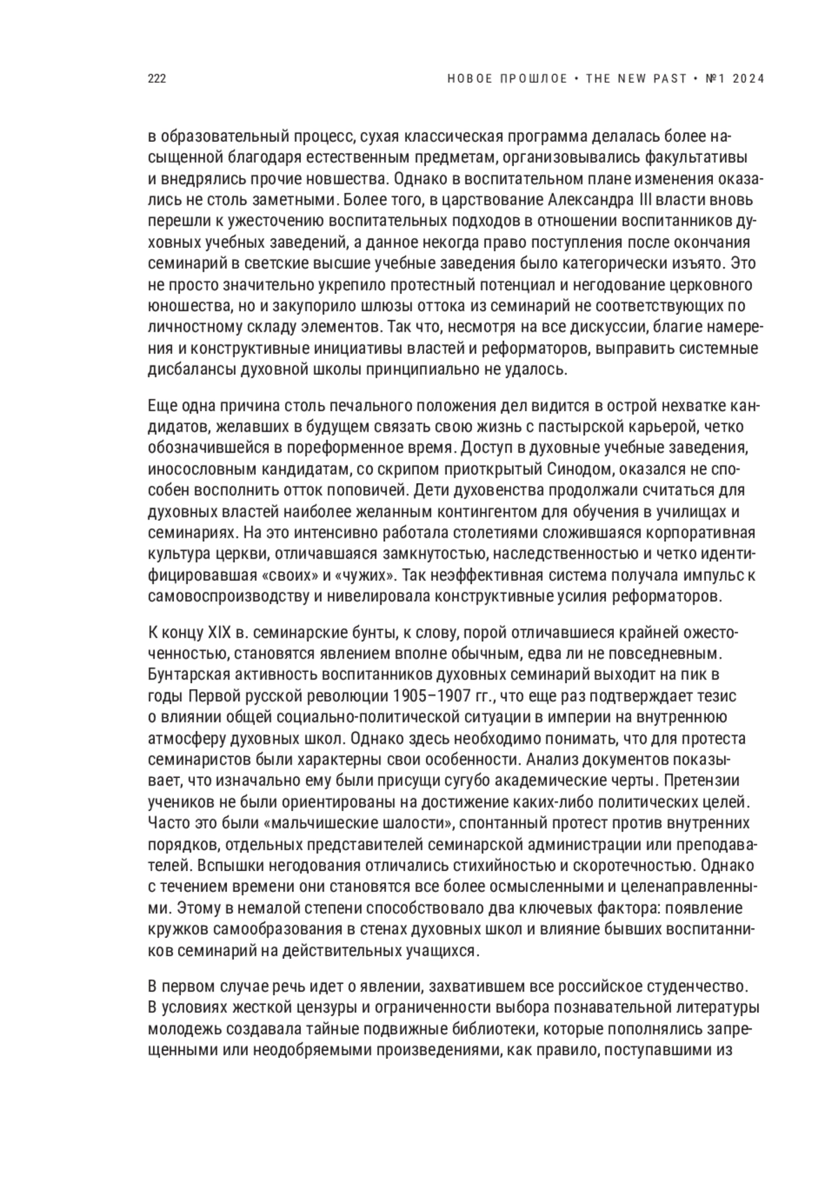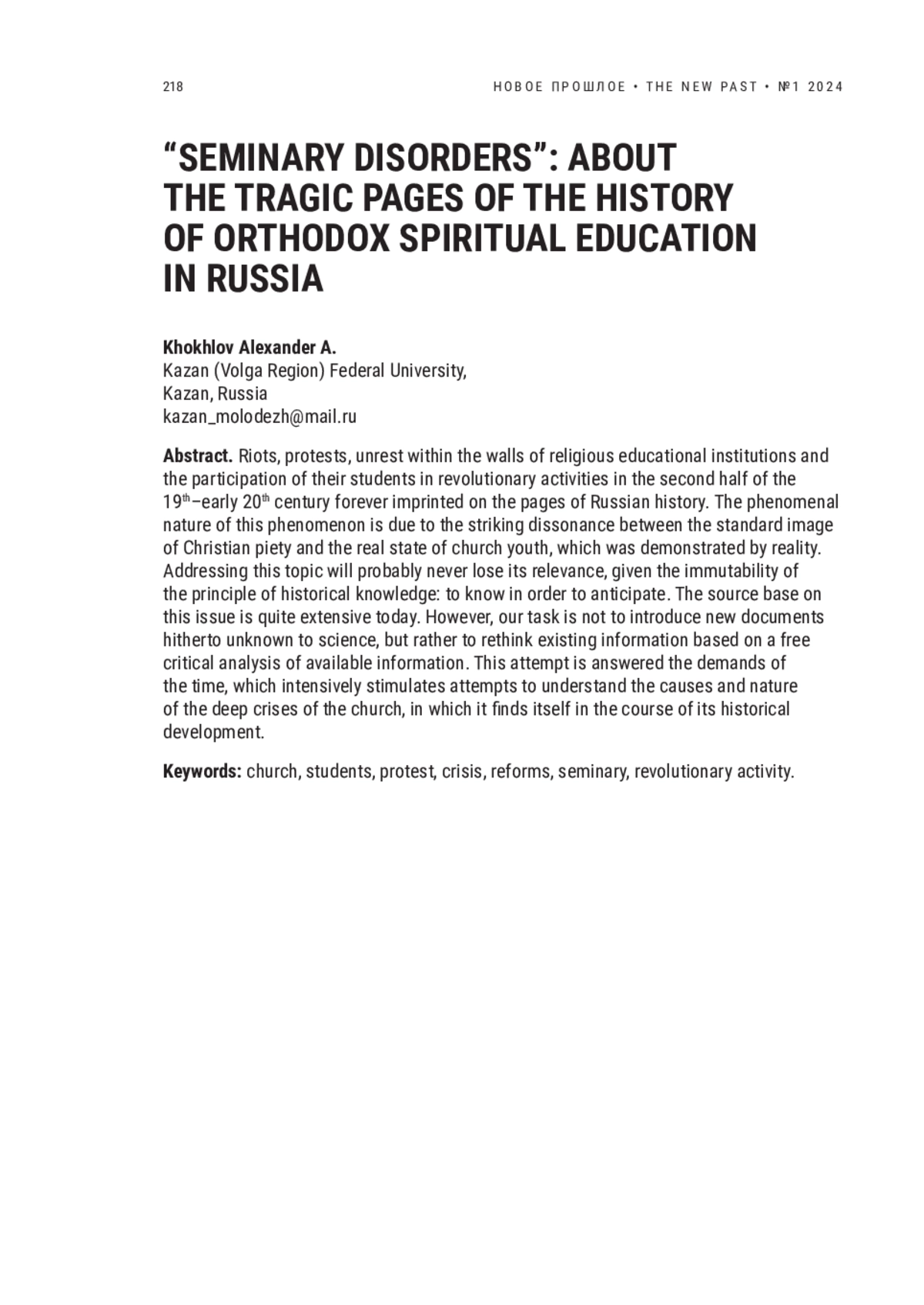 Бунты, протесты, волнения в стенах духовных учебных заведений и участие их воспитанников в революционной деятельности во второй половине XIX–начале XX вв. навсегда отпечатались на страницах российской истории. Феноменальный характер данного явления обусловливается тем разительным диссонансом между эталонным образом христианского благочестия и реальным состоянием церковного юношества, который демонстрировала действительность. Обращение к этой теме, вероятно, никогда не потеряет своей актуальности, учитывая неизменность принципа исторического познания: знать, чтобы предвидеть. Источниковая база по данной проблеме сегодня достаточно обширна. Однако наша задача видится не в вводе в оборот новых, доселе неизвестных науке документов, а скорее в переосмыслении уже имеющейся информации на основе свободного критического анализа доступных сведений. Данная попытка отвечает запросам времени, интенсивно стимулирующим стремление разобраться в причинах и характере глубоких кризисов церкви, в которых она оказывается по мере своего исторического развития