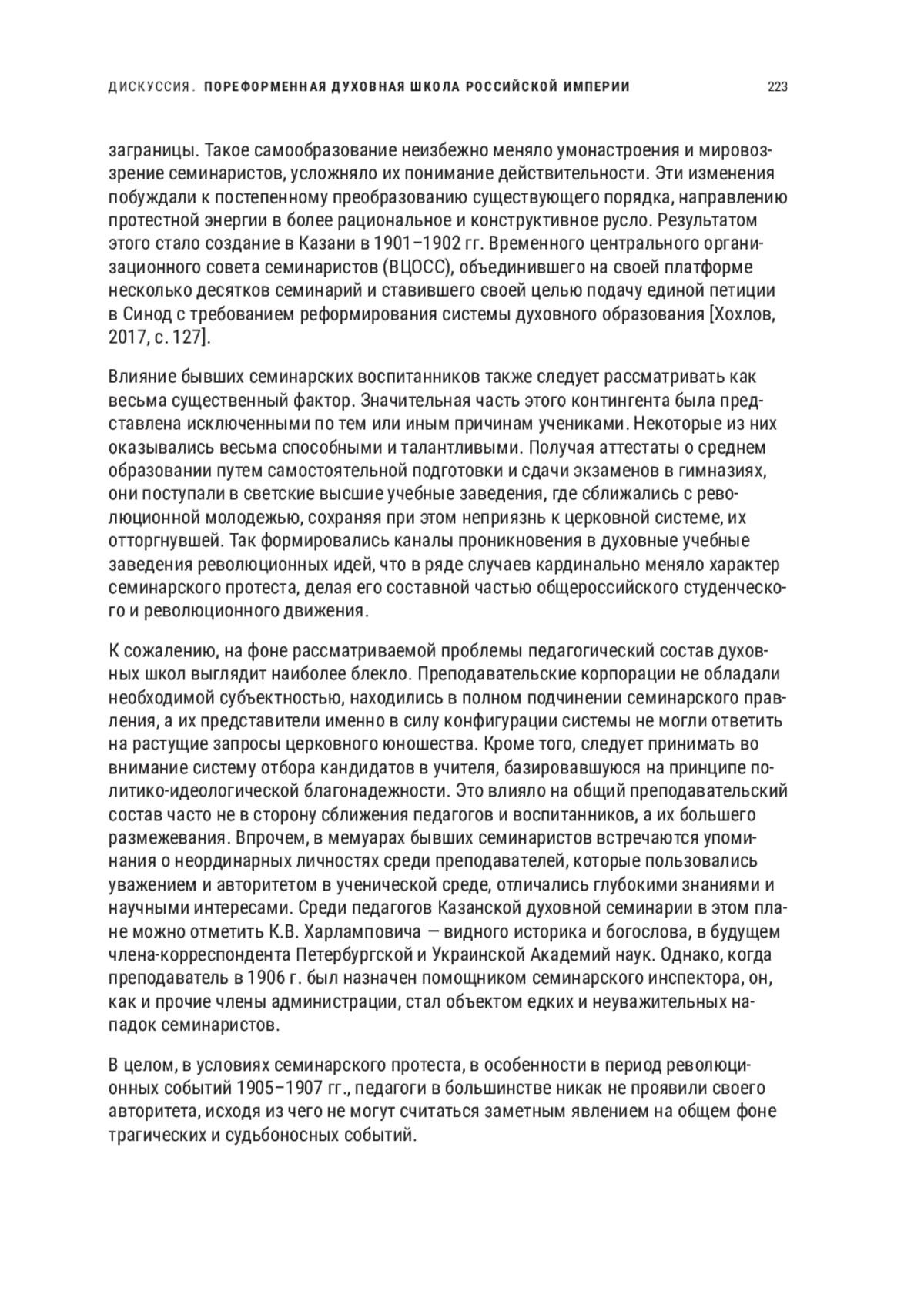В статье рассматриваются дискуссионные вопросы, связанные с реформами духовных школ Российской империи и их внутренней жизнью. Изучение комплекса архивных источников центрального и регионального архивов позволило сформулировать выводы о том, что реформы, проводившиеся в 1808 и 1867Ǿгг., были обусловлены необходимостью институционализации духовного образования, выработкой системы управления духовными школами, формированием программ для обучения и принципов отбора педагогов. После реформы 1867Ǿг. была сформирована трехступенчатая система духовного образования, готовившая кадры не только для Православной российской церкви, но и для гражданского ведомства, куда выпускники при желании имели право переходить после завершения обучения. На протяжении всей истории духовных школ не теряла актуальности проблема воспитания. Основным принципом формирования нравственности был строгий надзор за обучающимися, в том числе и обязательное участие в богослужениях. Однако это не исключало и эстетического образования, в частности обучения музыке. Проблема семинарских бунтов объяснялась интеллектуальными и политическими направлениями жизни общества конца XIX–начала XXǾв. — вовлеченностью воспитанников духовных школ в изучение европейской литературы, не лишенной политической направленности, и причастность к общесеминарскому союзу, боровшемуся за секуляризацию семинарского образования, корректное отношение преподавателей к воспитанникам и улучшение условий жизни учащихся. Преподаватели духовных школ были преимущественно заняты повседневной учебной работой, хотя среди них были и выдающиеся личности, чьи исследования были оценены не только в рамках Православной российской церкви