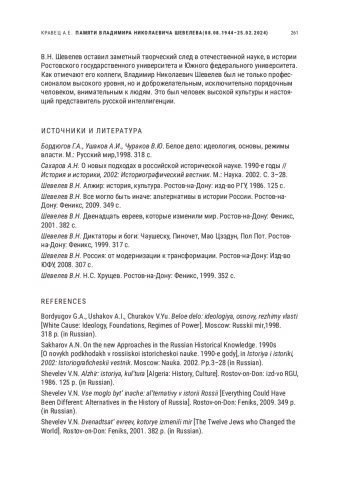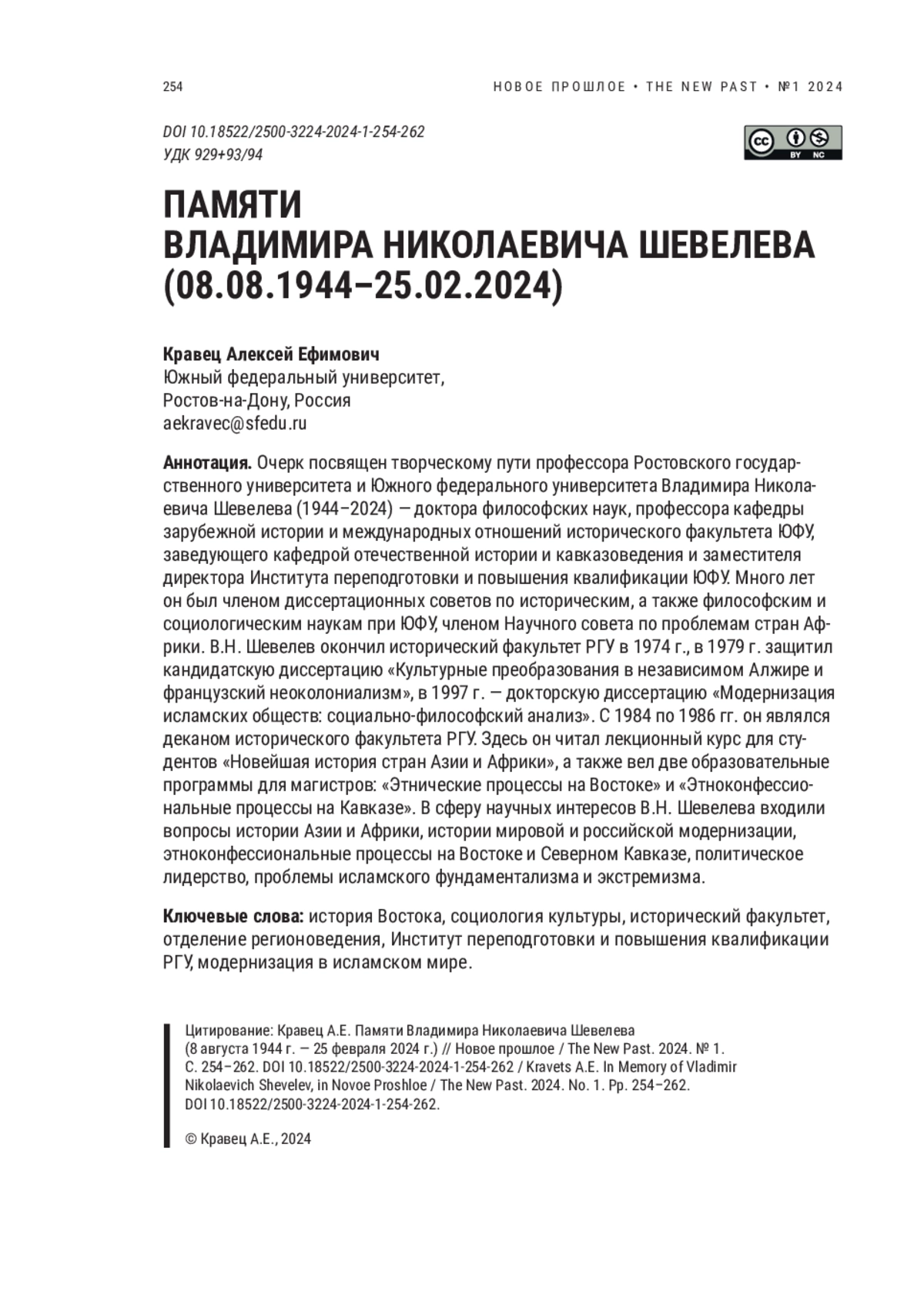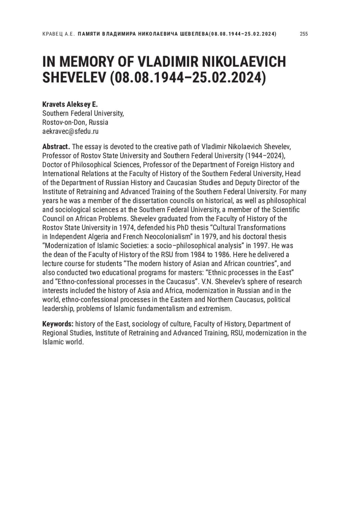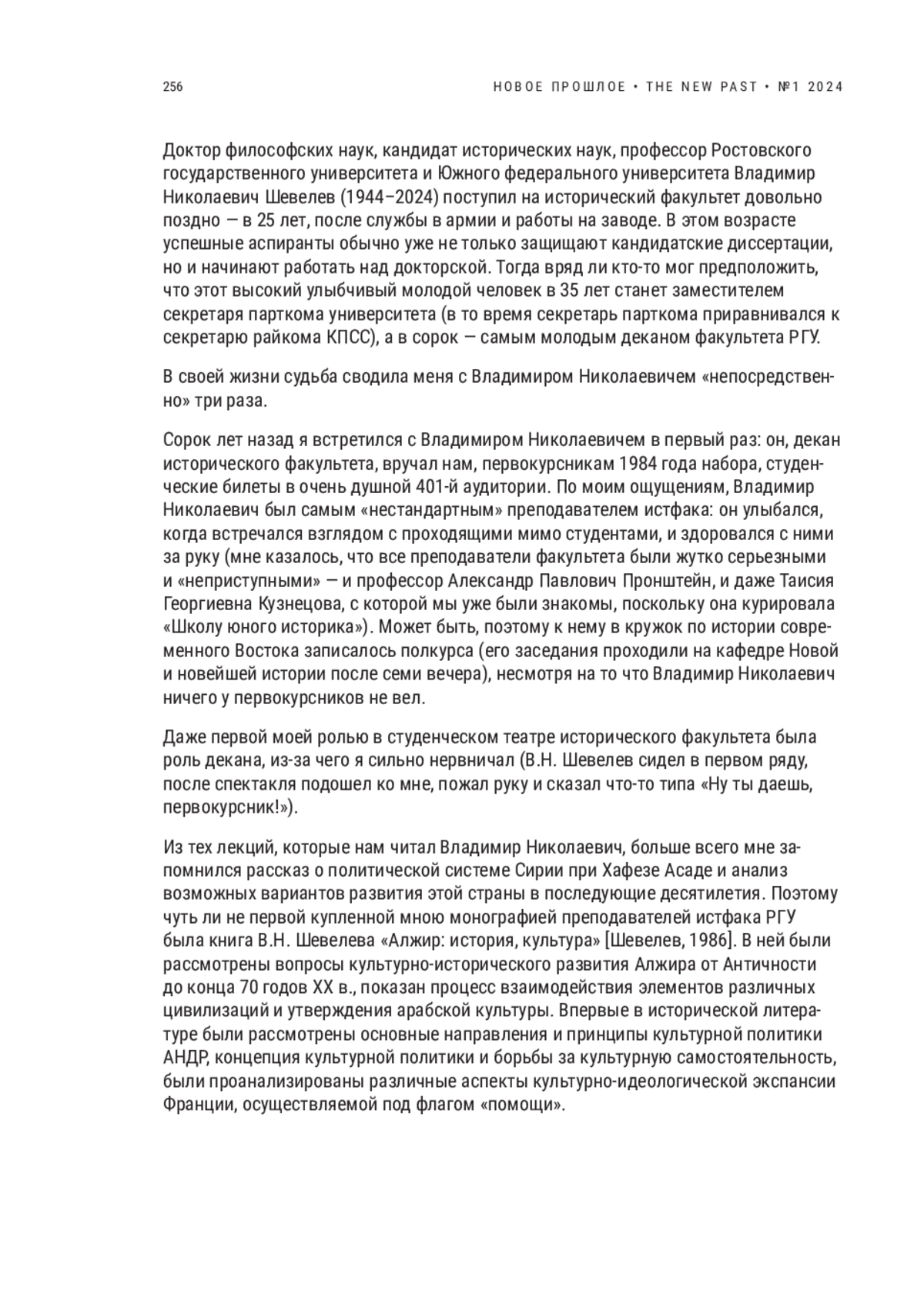 Очерк посвящен творческому пути профессора Ростовского государственного университета и Южного федерального университета Владимира Николаевича Шевелева (1944–2024) — доктора философских наук, профессора кафедры зарубежной истории и международных отношений исторического факультета ЮФУ, заведующего кафедрой отечественной истории и кавказоведения и заместителя директора Института переподготовки и повышения квалификации ЮФУ. Много лет он был членом диссертационных советов по историческим, а также философским и социологическим наукам при ЮФУ, членом Научного совета по проблемам стран Африки. В. Н. Шевелев окончил исторический факультет РГУ в 1974 г., в 1979 г. защитил кандидатскую диссертацию «Культурные преобразования в независимом Алжире и французский неоколониализм», в 1997 г. — докторскую диссертацию «Модернизация исламских обществ: социально-философский анализ». С 1984 по 1986 гг. он являлся деканом исторического факультета РГУ. Здесь он читал лекционный курс для студентов «Новейшая история стран Азии и Африки», а также вел две образовательные программы для магистров: «Этнические процессы на Востоке» и «Этноконфессиональные процессы на Кавказе». В сферу научных интересов В. Н. Шевелева входили вопросы истории Азии и Африки, истории мировой и российской модернизации, этноконфессиональные процессы на Востоке и Северном Кавказе, политическое лидерство, проблемы исламского фундаментализма и экстремизма