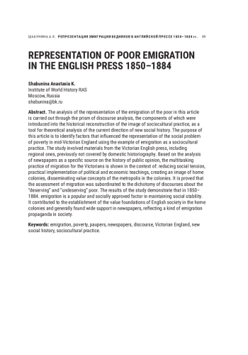Изучение репрезентации эмиграции бедняков в данной статье проведено через призму дискурс-анализа. Его компоненты были внедрены при анализе трансформации у викторианцев образа эмиграции как отдельной социокультурной практики. Как инструмент теоретического анализа, практики в направлении новой социальной истории допускают приобщение к исследованию дискурсивных методов. Цель данной статьи — выявление факторов, которые влияли на репрезентацию социальной проблемы бедности в средневикторианской Англии, на примере эмиграции как социокультурной практики. К исследованию были привлечены ранее не охваченные отечественной историографией материалы викторианской английской прессы, в том числе региональной. На основе анализа газет как специфичного источника по истории общественного мнения показана многозадачность практики миграции для викторианцев в контексте снижения социальной напряженности, практической реализации политико-экономических учений, формирования образа домашних колоний, распространения ценностных концептов метрополии в колониях. Доказывается, что оценка миграций была подчинена дихотомии дискурсов об «одобряемом» и «порицаемом» бедняке. Результаты исследования демонстрируют, что в 1850–1884 гг. эмиграция выступает популярным и одобряемым социумом фактором поддержания социальной стабильности. Она способствовала утверждению ценностных оснований английского общества в домашних колониях и в целом находила широкую поддержку в газетах, публикационная деятельность которых транслировала эмиграционную пропаганду