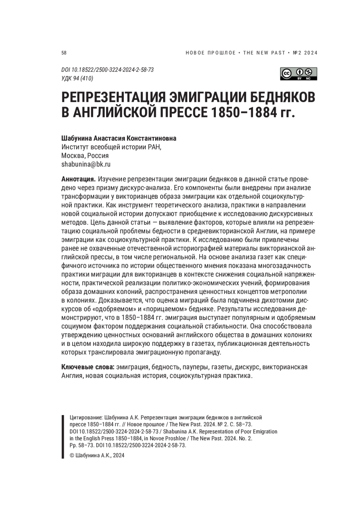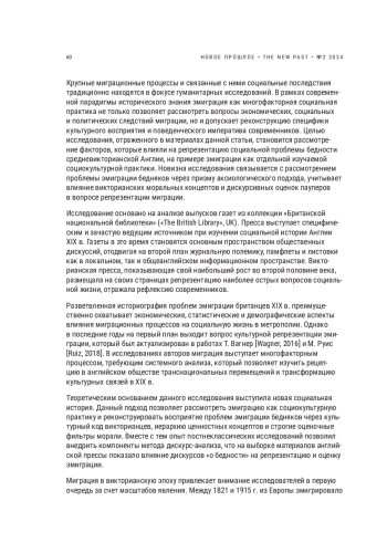 Крупные миграционные процессы и связанные с ними социальные последствия традиционно находятся в фокусе гуманитарных исследований. В рамках современной парадигмы исторического знания эмиграция как многофакторная социальная практика не только позволяет рассмотреть вопросы экономических, социальных и политических следствий миграции, но и допускает реконструкцию специфики культурного восприятия и поведенческого императива современников. Целью исследования, отраженного в материалах данной статьи, становится рассмотрение факторов, которые влияли на репрезентацию социальной проблемы бедности средневикторианской Англии, на примере эмиграции как отдельной изучаемой социокультурной практики. Новизна исследования связывается с рассмотрением проблемы эмиграции бедняков через призму аксиологического подхода, учитывает влияние викторианских моральных концептов и дискурсивных оценок пауперов в вопросе репрезентации миграции