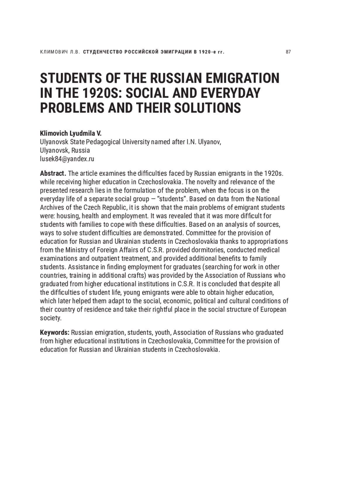 16. Klimovich L.V., Kovaleva D.N. A Social and Cultural Profile of the Younger Generation of the Russian Emigration in the 1920-1930s (Based on the Documents of the Archive of Yugoslavia) // Balkanistic Forum. 2019. № 2. Рp. 46-59. EDN: NRJAQW