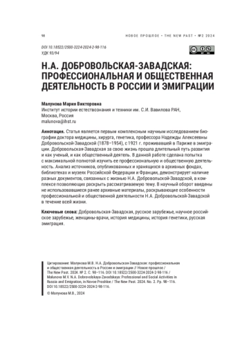 Статья является первым комплексным научным исследованием биографии доктора медицины, хирурга, генетика, профессора Надежды Алексеевны Добровольской-Завадской (1878–1954), с 1921 г. проживавшей в Париже в эмиграции. Добровольская-Завадская за свою жизнь прошла длительный путь развития и как ученый, и как общественный деятель. В данной работе сделана попытка с максимальной полнотой изучить ее профессиональную и общественную деятельность. Анализ источников, опубликованных и хранящихся в архивных фондах, библиотеках и музеях Российской Федерации и Франции, демонстрирует наличие разных документов, связанных с жизнью Н. А. Добровольской-Завадской, в комплексе позволяющих раскрыть рассматриваемую тему. В научный оборот введены не использовавшиеся ранее архивные материалы, раскрывающие особенности профессиональной и общественной деятельности Н. А. Добровольской-Завадской в течение всей жизни