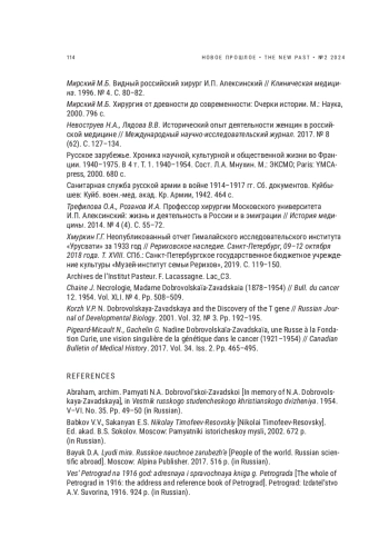 32. Chaine J. Necrologie, Madame Dobrovolskaïa-Zavadskaia (1878-1954) // Bull. du cancer 12. 1954. Vol. XLI. № 4. Pp. 508-509.