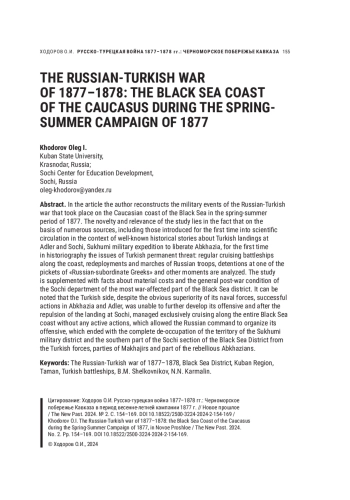 В статье автор реконструирует военные события Русско-турецкой войны, происходившие на кавказском побережье Черного моря в весенне-летний период 1877 г. Новизна и актуальность исследования заключается в том, что на основе многочисленных источников, в том числе впервые вводимых в научный оборот в контексте известных исторических сюжетов о турецких десантах у Адлера и Сочи, Сухумской военной экспедиции по освобождению Абхазии, впервые в историографии рассмотрены вопросы турецкой перманентной угрозы: регулярных крейсирований броненосцев вдоль побережья, передислокаций и маршей российских войск, задержаний на одном из пикетов «русскоподданных греков» и другие моменты. Исследование дополнено фактами о материальных издержках и общем послевоенном состоянии Сочинского отдела — наиболее пострадавшей от войны части Черноморского округа. Можно отметить, что турецкая сторона, несмотря на очевидное превосходство своих военно-морских сил, успешных действий в Абхазии и у Адлера, не смогла в дальнейшем развить свое наступление и после отбитого десанта у Сочи обходилась исключительно крейсированием вдоль всего Черноморского побережья без каких-либо активных действий, что позволило российскому командованию организовать свое наступление, завершившееся полной деоккупацией территории Сухумского военного округа и южной части Сочинского отдела Черноморского округа от турецких сил, партий махаджиров и части восставших абхазов